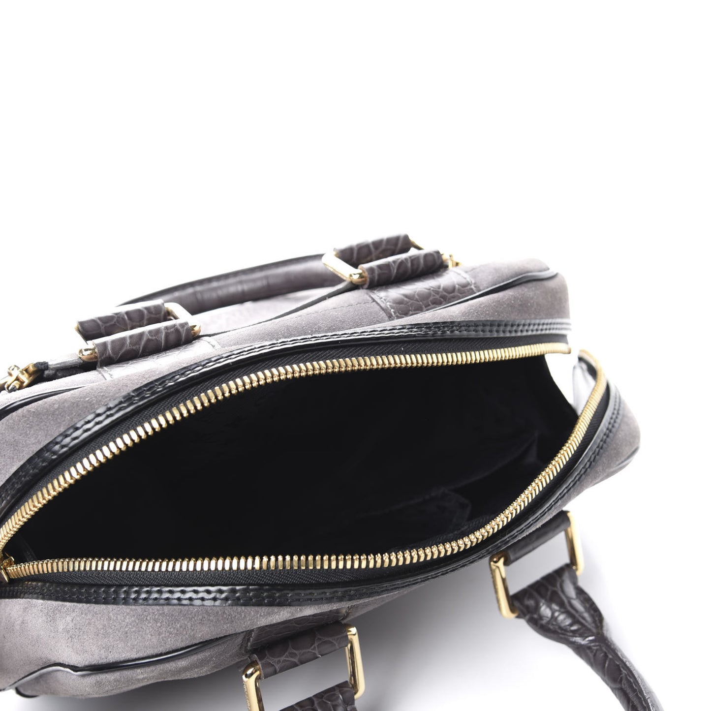 This is an authentic LOUIS VUITTON Havane Stamped Trunk Bowler PM in Gray. This stylish bowler style tote is beautifully crafted of fine gray suede with polished black leather trim, gray crocodile handles, a large round stamped Louis Vuitton front emblem and polished brass hardware including front zipper medallions and ornate studs. The 3/4 wrap around zipper opens to a LV black monogram jacquard fabric with patch pockets.Follow this item for alerts. Louis Vuitton is a registered trademark of Louis Vuitton. FASHIONPHILE is not affiliated with Louis Vuitton.