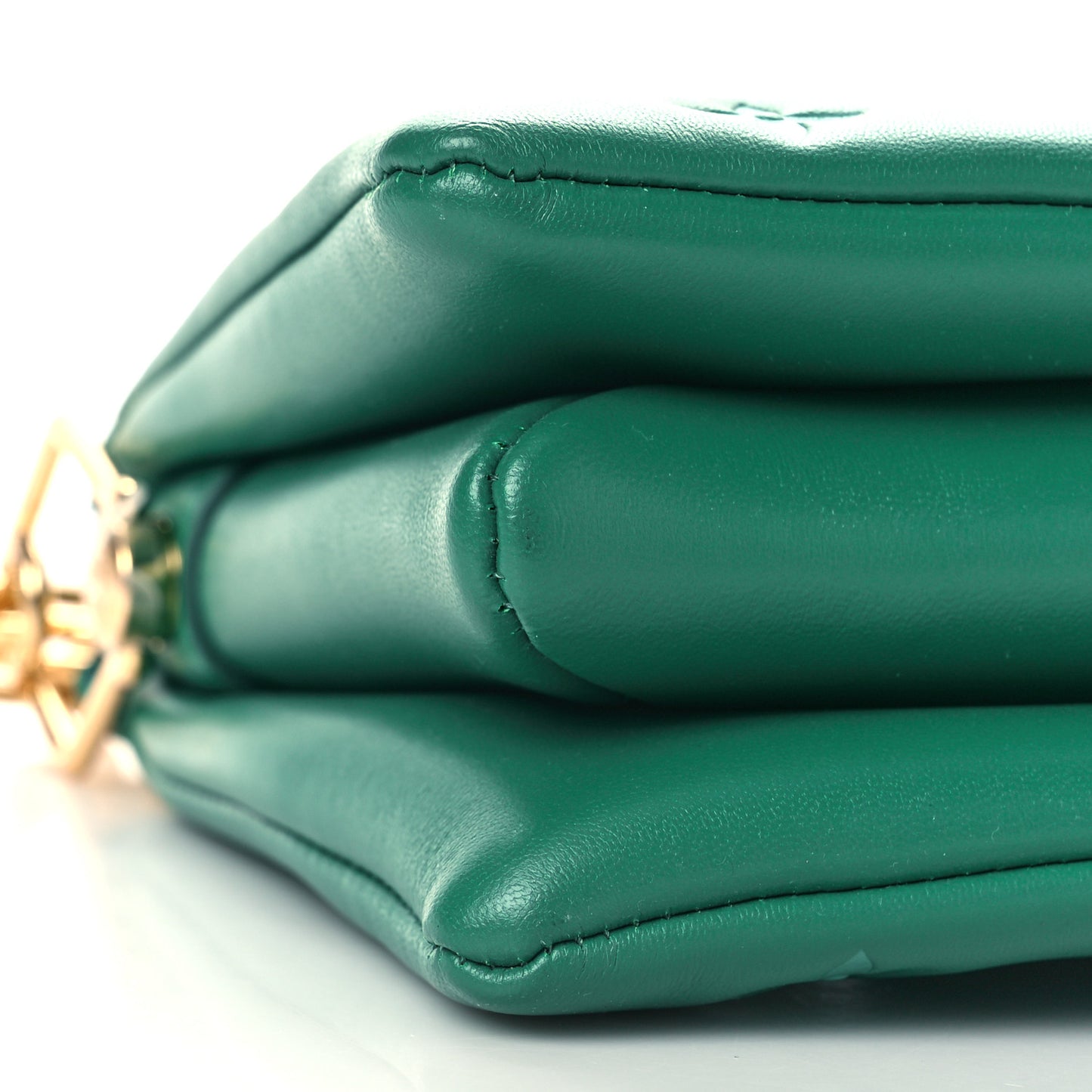 This is an authentic LOUIS VUITTON Lambskin Embossed Monogram Coussin BB in Emeraude. From Louis Vuitton's spring 2021 collection, this soft and supple shoulder bag is crafted of puffy monogram-embossed lambskin leather in green.The bag can be carried solo as a clutch, with the gold hardware Edge Chain strap, or with the adjustable canvas strap for wearing crossbody or on the shoulder. The top zipper opens to a partitioned green microfiber interior.Follow this item for alerts. Louis Vuitton is a registered trademark of Louis Vuitton. FASHIONPHILE is not affiliated with Louis Vuitton.