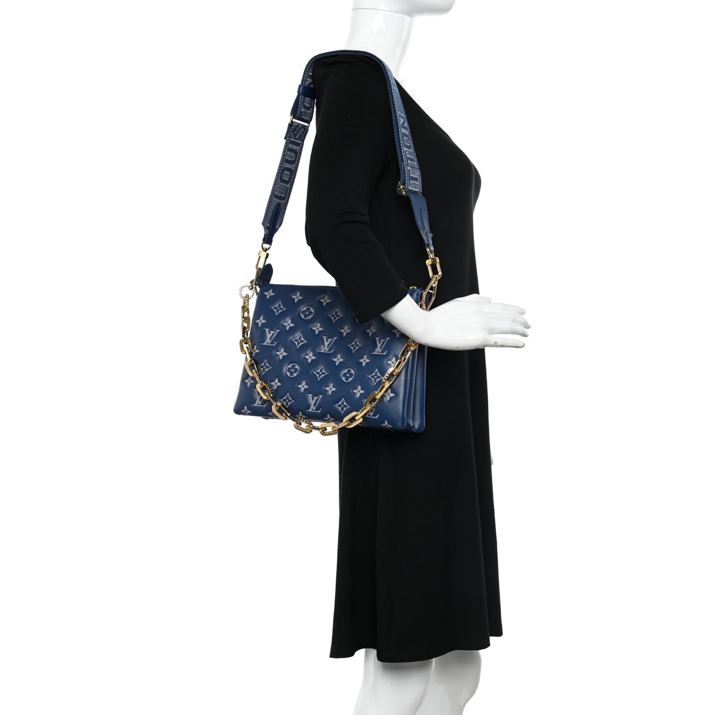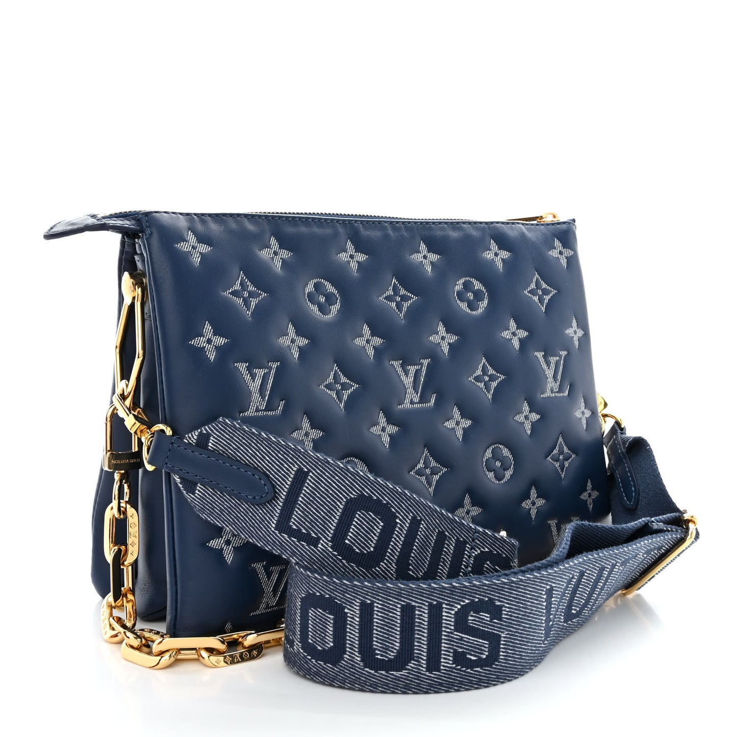 This is an authentic LOUIS VUITTON Lambskin Embossed Monogram Coussin PM in Denim Blue. From Louis Vuitton's spring 2021 collection, this soft and supple shoulder bag is crafted of puffy lambskin leather in navy blue and is embossed with the Louis Vuitton monogram in white. The bag can be carried solo as a clutch, with the gold hardware Edge Chain strap, or with the adjustable blue canvas strap. The three zippered compartments are lined in denim microfiber.Follow this item for alerts. Louis Vuitton is a registered trademark of Louis Vuitton. FASHIONPHILE is not affiliated with Louis Vuitton.