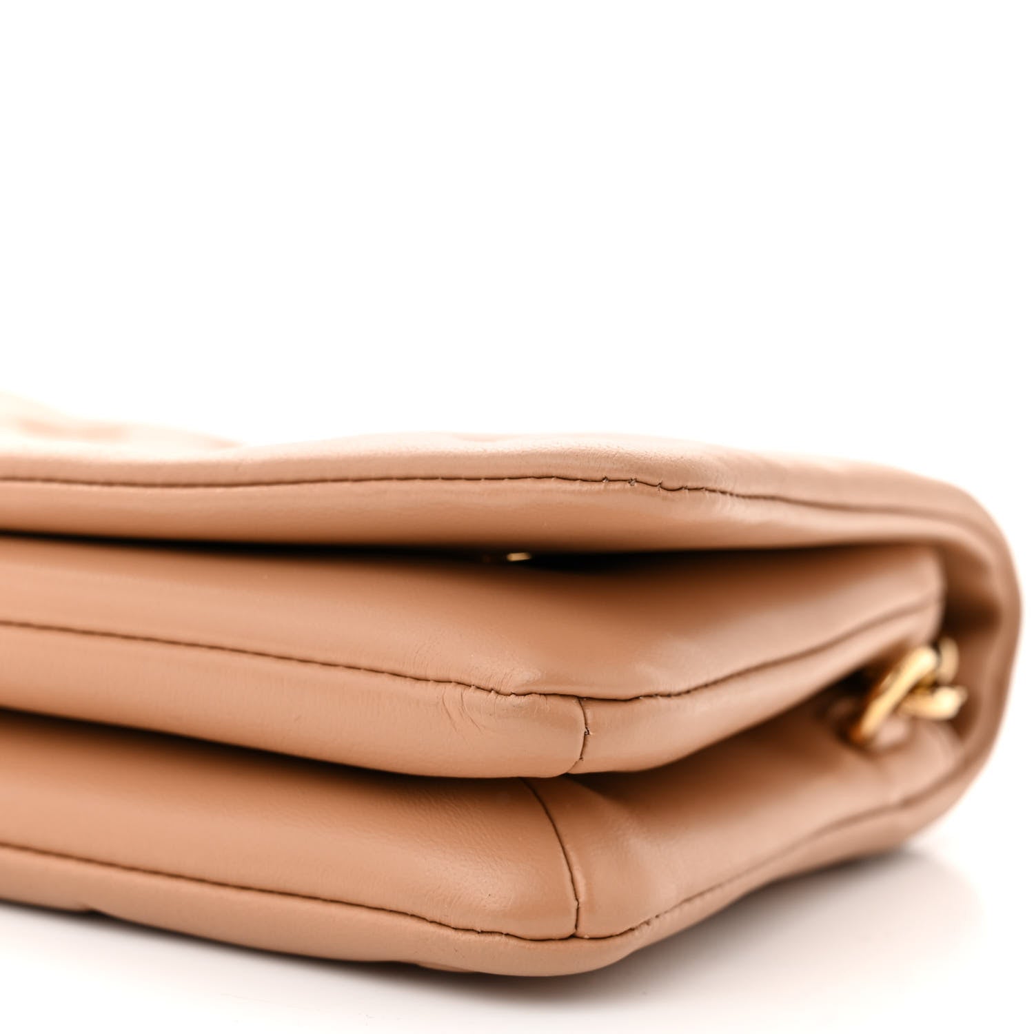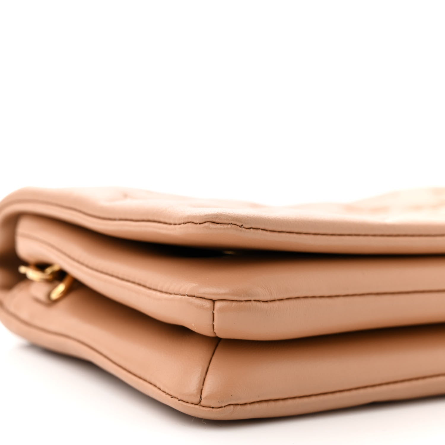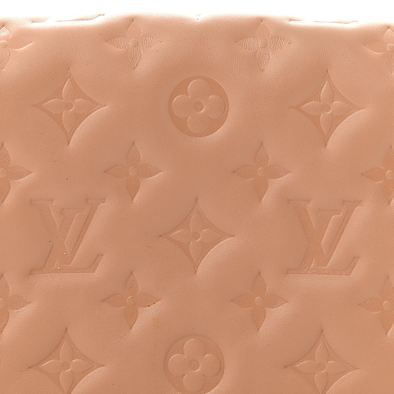 This is an authentic LOUIS VUITTON Lambskin Embossed Monogram Pochette Coussin in Camel. From Louis Vuitton's spring 2021 collection, this soft and supple shoulder bag is featured in puffy lambskin in beige, and is embossed with Louis Vuitton monogram. The bag can be carried solo as a clutch, or with the gold hardware edge chain strap. The front flap opens to a navy blue microfiber interior with zipper and patch pockets.Follow this item for alerts. Louis Vuitton is a registered trademark of Louis Vuitton. FASHIONPHILE is not affiliated with Louis Vuitton.