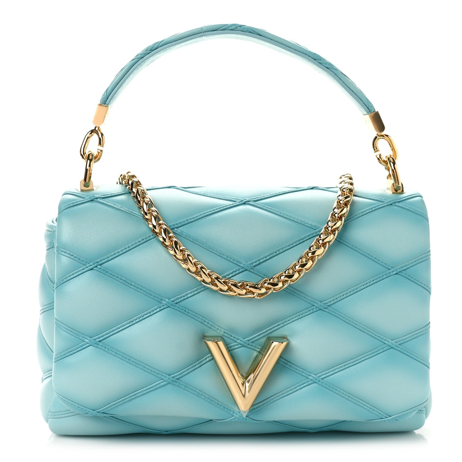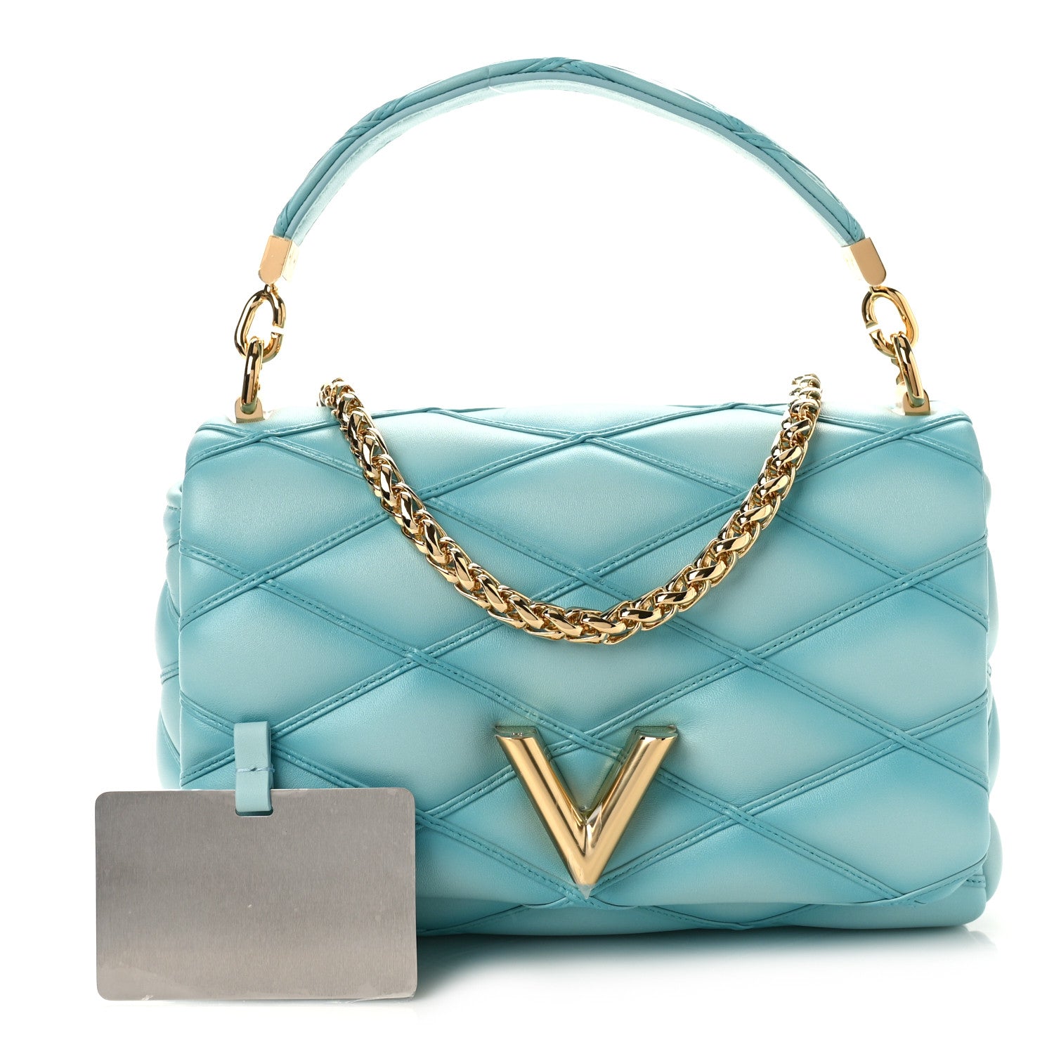 This is an authentic LOUIS VUITTON Lambskin Malletage GO-14 MM in Lagoon. This stylish waist-length crossbody shoulder bag is crafted of quilted lambskin leather in a shade of blue-ish green. The chic bag features a polished gold chain shoulder strap with a leather shoulder pad and a polished LV twist lock on the facing flap. This opens to a leather interior with a small patch pocket with mirror included.Follow this item for alerts. Louis Vuitton is a registered trademark of Louis Vuitton. FASHIONPHILE is not affiliated with Louis Vuitton.