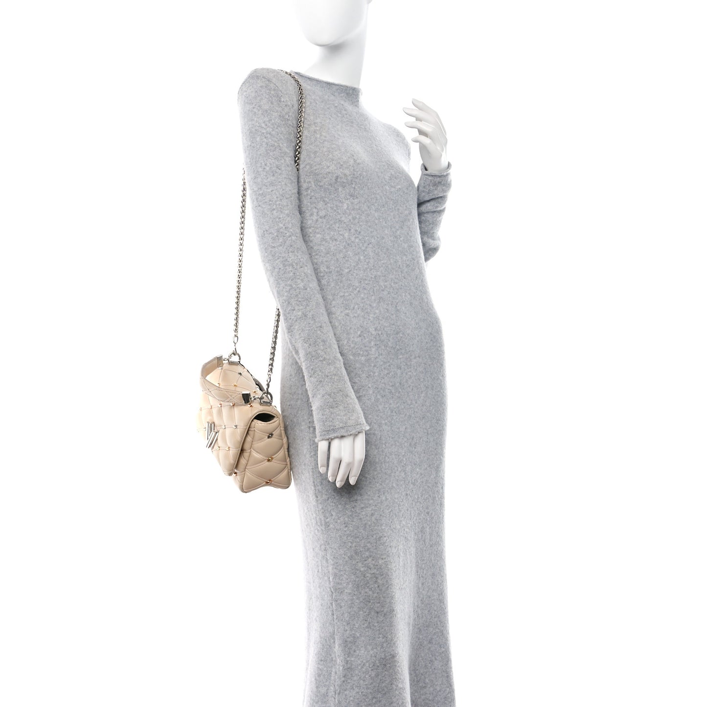 This is an authentic LOUIS VUITTON Lambskin Studded Malletage GO-14 MM in Beige. This cross-body shoulder bag is crafted of soft criss cross quilted lambskin leather. The shoulder bag features a silver sliding chain link shoulder strap with a leather shoulder pad and silver and gold studs throughout the bag. The silver V snap closure opens the flap to a tan leather interior with pocket and mirror.