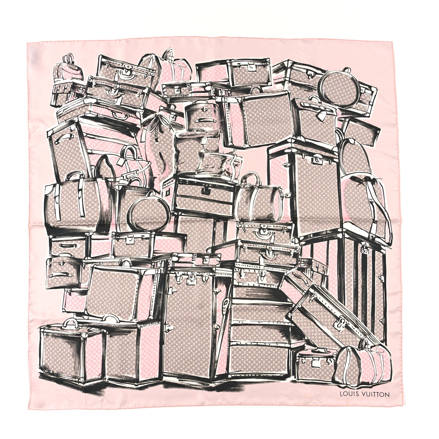 This is an authentic LOUIS VUITTON Silk Monogram Trunks Square Scarf in Rose Poudre. This is a 100% silk scarf and recalls the style, tradition, and heritage of Louis Vuitton. This light pink scarf is a very large square featuring the traditional Louis Vuitton luggage like the historic Louis Vuitton steamer trunks, hat boxes, keepalls and other pieces of luggage.