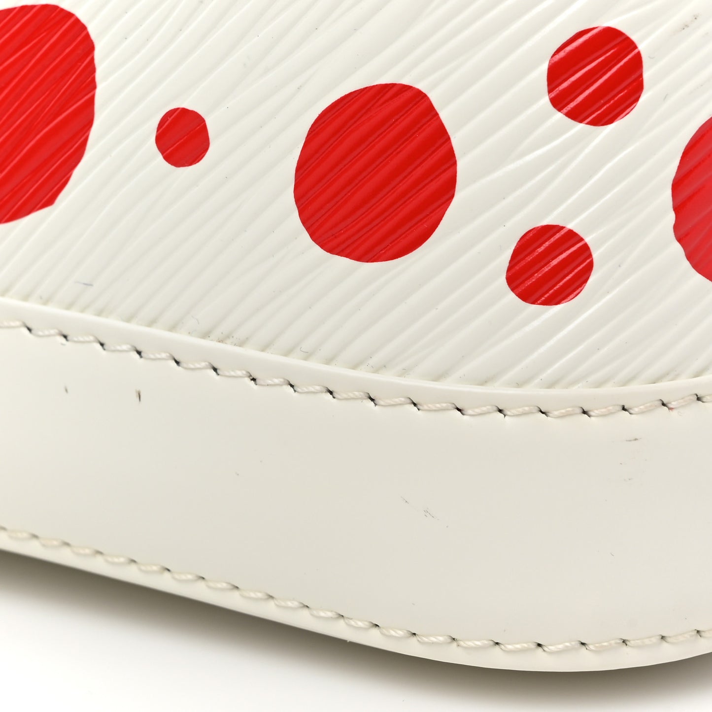 This is an authentic LOUIS VUITTON LV X YK Epi Alma BB in White. This stunning bag features a graphic polka dot pattern from artist Yayoi Kusama printed in white on red Louis Vuitton coated canvas canvas. The bag features red rolled leather top handles and trim with silver hardware. The top zipper opens to a red fabric interior with a flat pocket.Follow this item for alerts. Louis Vuitton is a registered trademark of Louis Vuitton. FASHIONPHILE is not affiliated with Louis Vuitton.