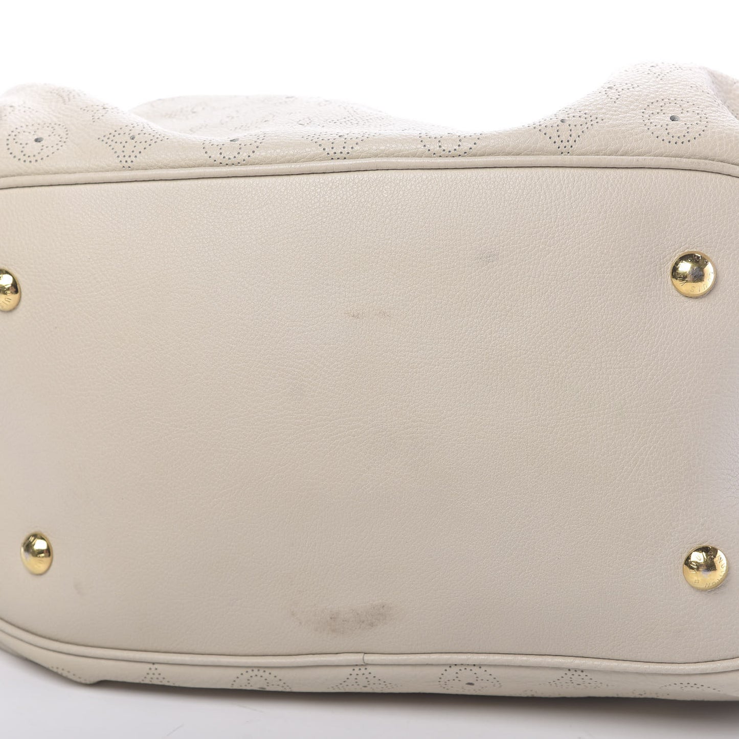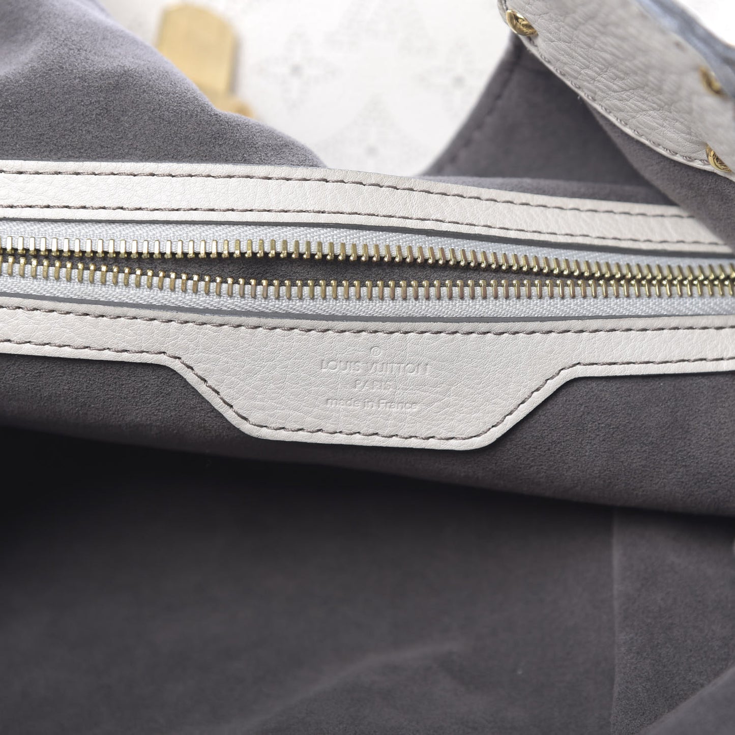 This is an authentic LOUIS VUITTON Mahina size L in Ivory. The mahina leather is perforated with the Louis Vuitton monogram throughout the bag, with ivory cowhide leather at the gathered top corners and looping handles. There is a polished brass press lock that opens to a grey alcantara microfiber interior with a zipper pocket. This is an excellent bag with a special touch of luxury and style, from Louis Vuitton!Follow this item for alerts. Louis Vuitton is a registered trademark of Louis Vuitton. FASHIONPHILE is not affiliated with Louis Vuitton.