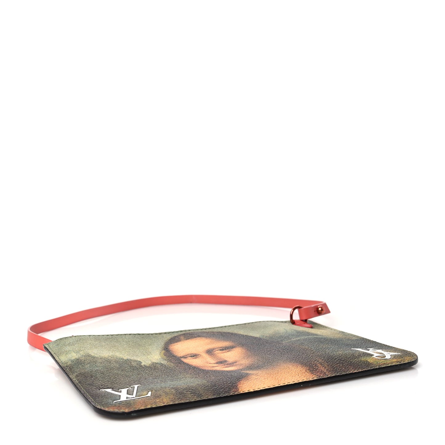 This is an authentic LOUIS VUITTON Masters Da Vinci Neverfull MM Pochette. This pochette is made of a rendition of a Da Vinci painting of the Mona Lisa on coated canvas. The pochette features a pink calfskin shoulder strap, silver reflective metallic letters that are "LV" and "JK" for LOUIS VUITTON and Jeff Koons. The top zipper opens to a pink leather interior with a pocket.Follow this item for alerts. Louis Vuitton is a registered trademark of Louis Vuitton. FASHIONPHILE is not affiliated with Louis Vuitton.