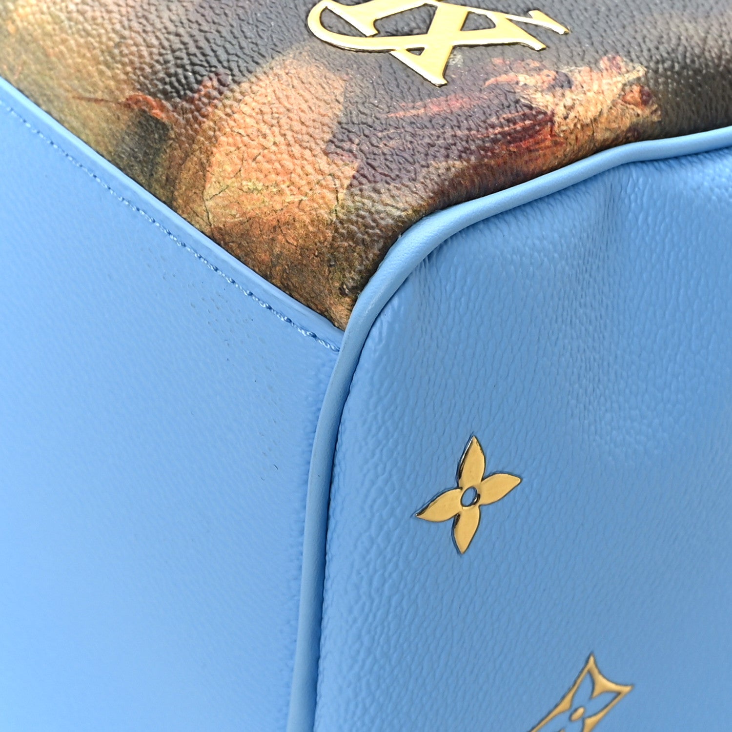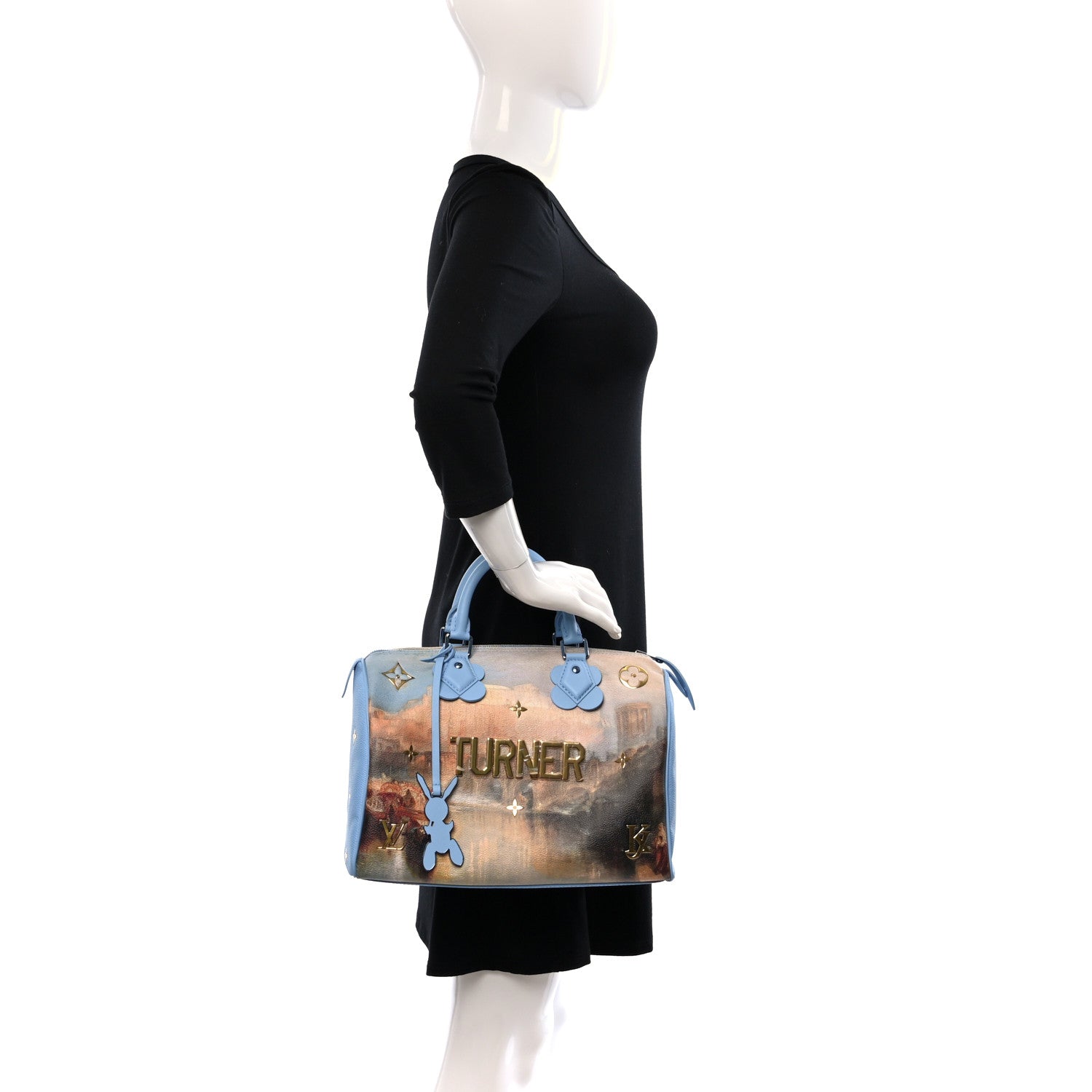 This is an authentic LOUIS VUITTON Masters Turner Speedy 30. This chic handbag is made of a rendition of a Turner painting of a Lake with a bridge in the background on coated canvas. It features periwinkle calfskin leather trim, rolled leather top handles, gold Monogram serti flower shapes and bold gold reflective letters that spell Van Gogh along with LV and JK initials. The top zipper opens to a matching leather interior that is printed in gold foil that tells you more about this exciting collaboration and adorned with patch pockets.Follow this item for alerts. Louis Vuitton is a registered trademark of Louis Vuitton. FASHIONPHILE is not affiliated with Louis Vuitton.