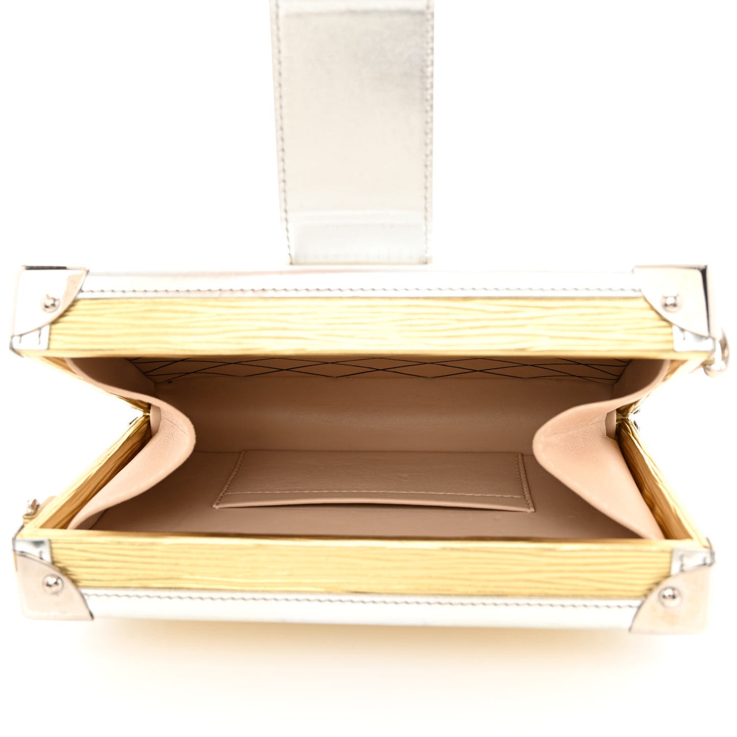 This is an authentic LOUIS VUITTON Metallic Epi Petite Malle in Gold. This stylish structured clutch is crafted of textured epi leather in gold. The bag features an optional leather versatile cross-body shoulder strap, and a decorative silver leather trim on all corners detailed with silver and gold studs. This durable clutch also features gold buckles and a cross-over leather strap with a polished silver press-lock that opens to a beige leather interior with a pocket.Follow this item for alerts. Louis Vuitton is a registered trademark of Louis Vuitton. FASHIONPHILE is not affiliated with Louis Vuitton.