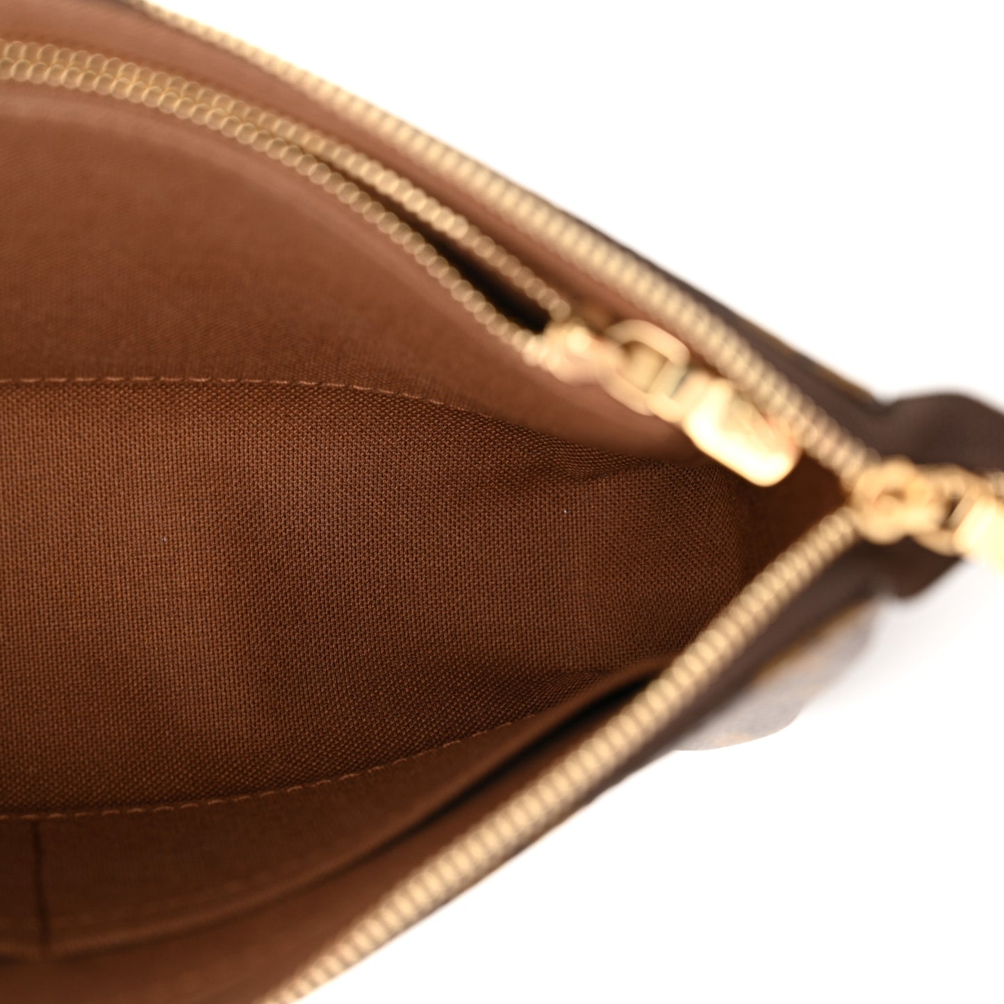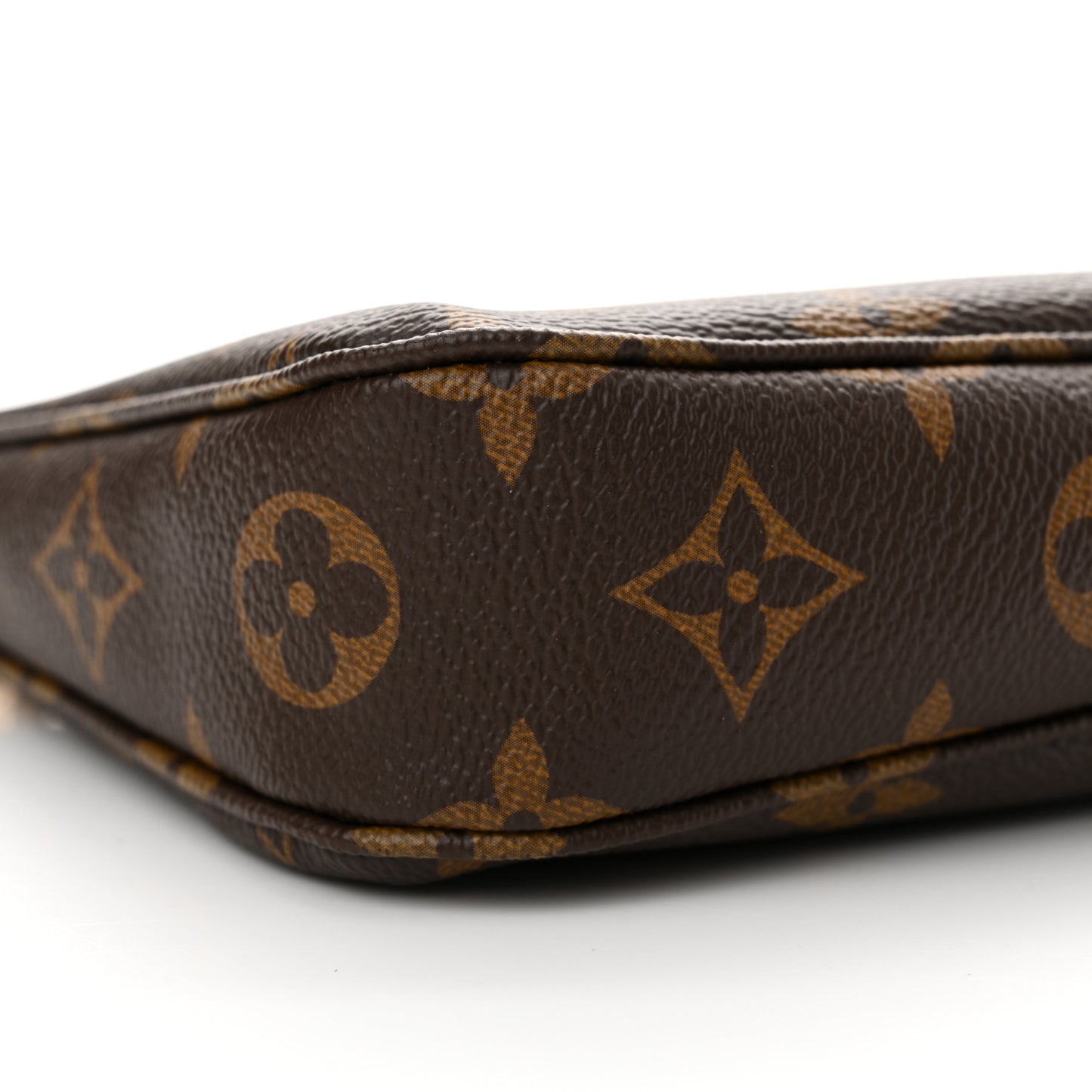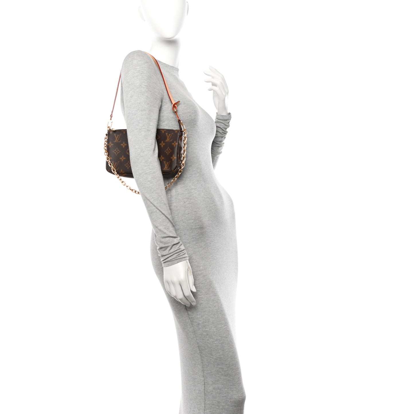 This is an authentic LOUIS VUITTON Monogram Chain Pochette Accessories. This pochette is crafted of signature Louis Vuitton monogram coated canvas in brown. The bag features a removable vachetta leather strap and gold-toned hardware. The top zipper opens to a brown fabric interior.Follow this item for alerts. Louis Vuitton is a registered trademark of Louis Vuitton. FASHIONPHILE is not affiliated with Louis Vuitton.