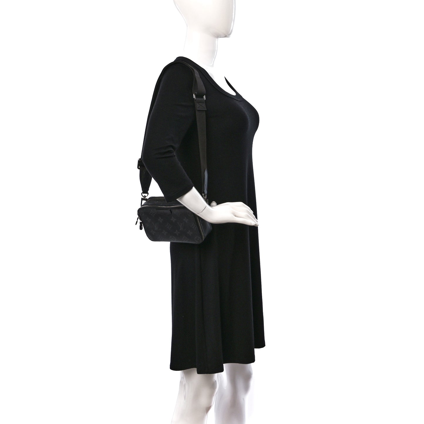 This is an authentic LOUIS VUITTON Monogram Eclipse Alpha Wearable Wallet. The bag is a small shoulder bag with a sturdy structure crafted of classic Louis Vuitton monogram coated toile canvas in graphite. The bag features two zippered compartments, and an adjustable nylon shoulder strap with leather trim. The top zipper opens a black fabric with leather card slots and patch pockets.Follow this item for alerts. Louis Vuitton is a registered trademark of Louis Vuitton. FASHIONPHILE is not affiliated with Louis Vuitton.
