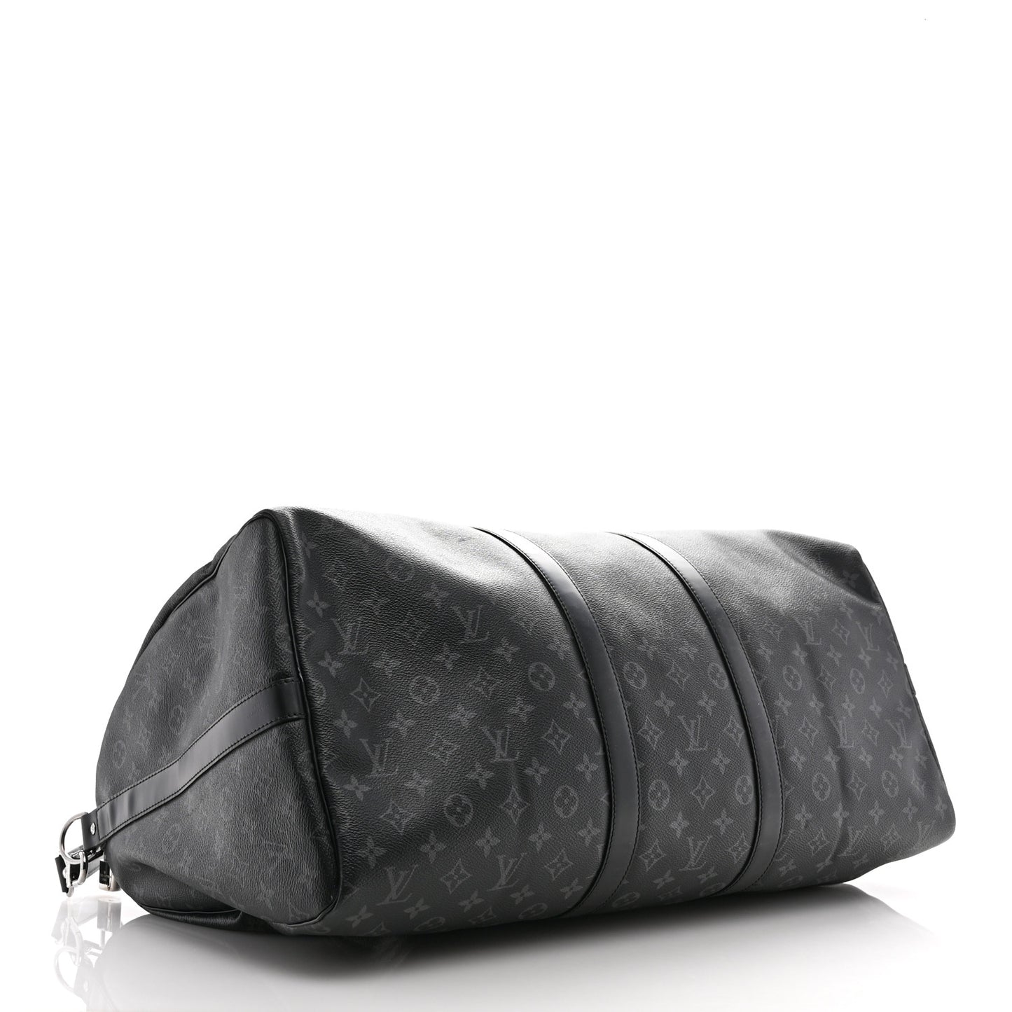 This is an authentic LOUIS VUITTON Monogram Eclipse Keepall Bandouliere 55. This stylish duffel is crafted of Louis Vuitton monogram on toile coated canvas in grey on black. It features black leather trim, rolled top handles, an optional leather shoulder strap, and silver hardware. The polished silver top zippers open to a spacious black fabric interior.Follow this item for alerts. Louis Vuitton is a registered trademark of Louis Vuitton. FASHIONPHILE is not affiliated with Louis Vuitton.