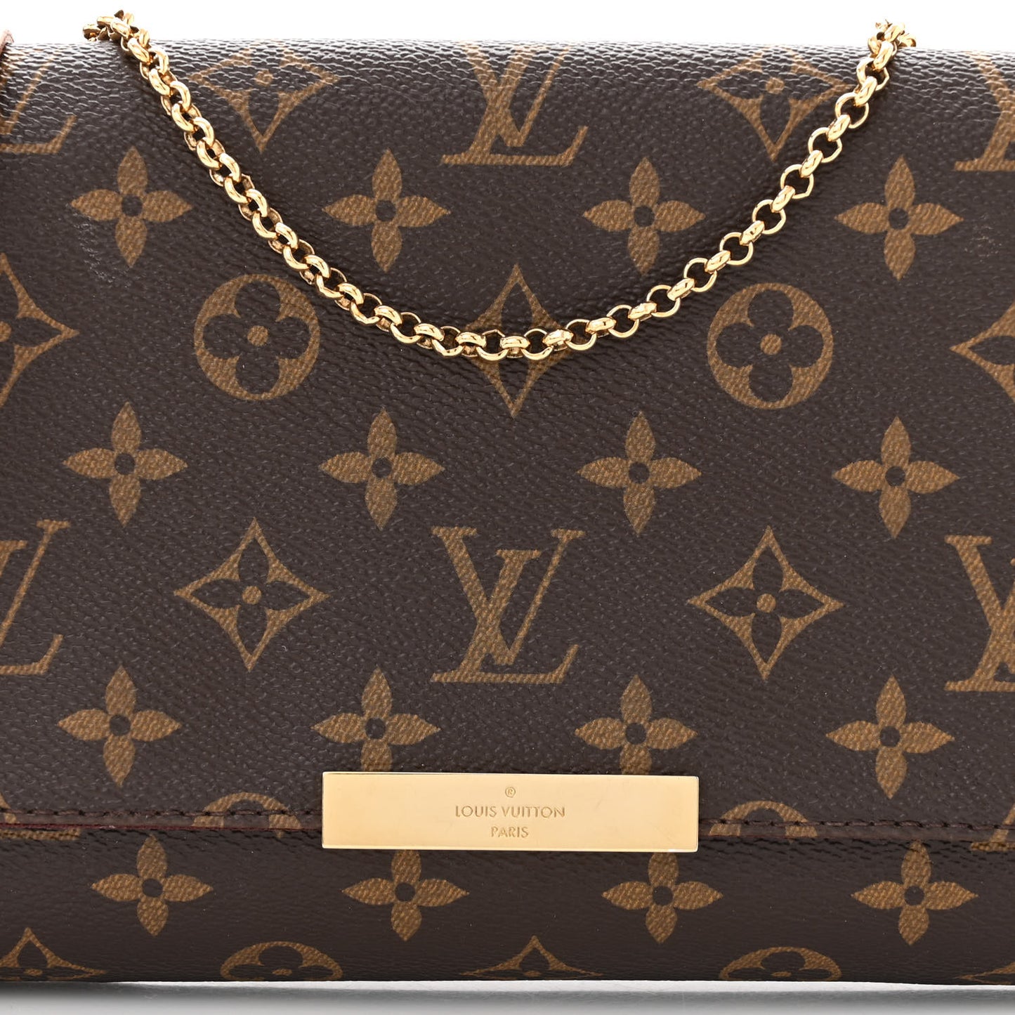 This is an authentic LOUIS VUITTON Monogram Favorite MM. This stylish shoulder bag is crafted of monogram coated canvas in brown. The bag features a polished gold chain strap, an optional vachetta leather shoulder strap, and polished gold hardware. The front flap opens with a magnetic gold bar to a burgundy fabric interior with a flat pocket.Follow this item for alerts. Louis Vuitton is a registered trademark of Louis Vuitton. FASHIONPHILE is not affiliated with Louis Vuitton.