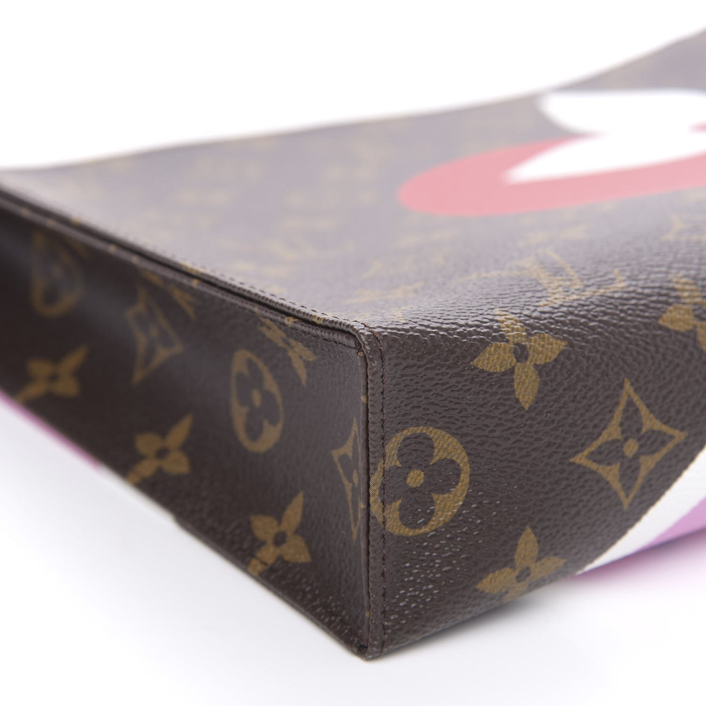This is an authentic LOUIS VUITTON Monogram Game On Toiletry Pouch 26. This handy travel accessory is crafted of traditional Louis Vuitton monogram toile canvas with heart prints. It features a top overextended zipper that opens to a spacious beige leather-like interior. This is an excellent pouch to store all of your small travel needs, from Louis Vuitton!