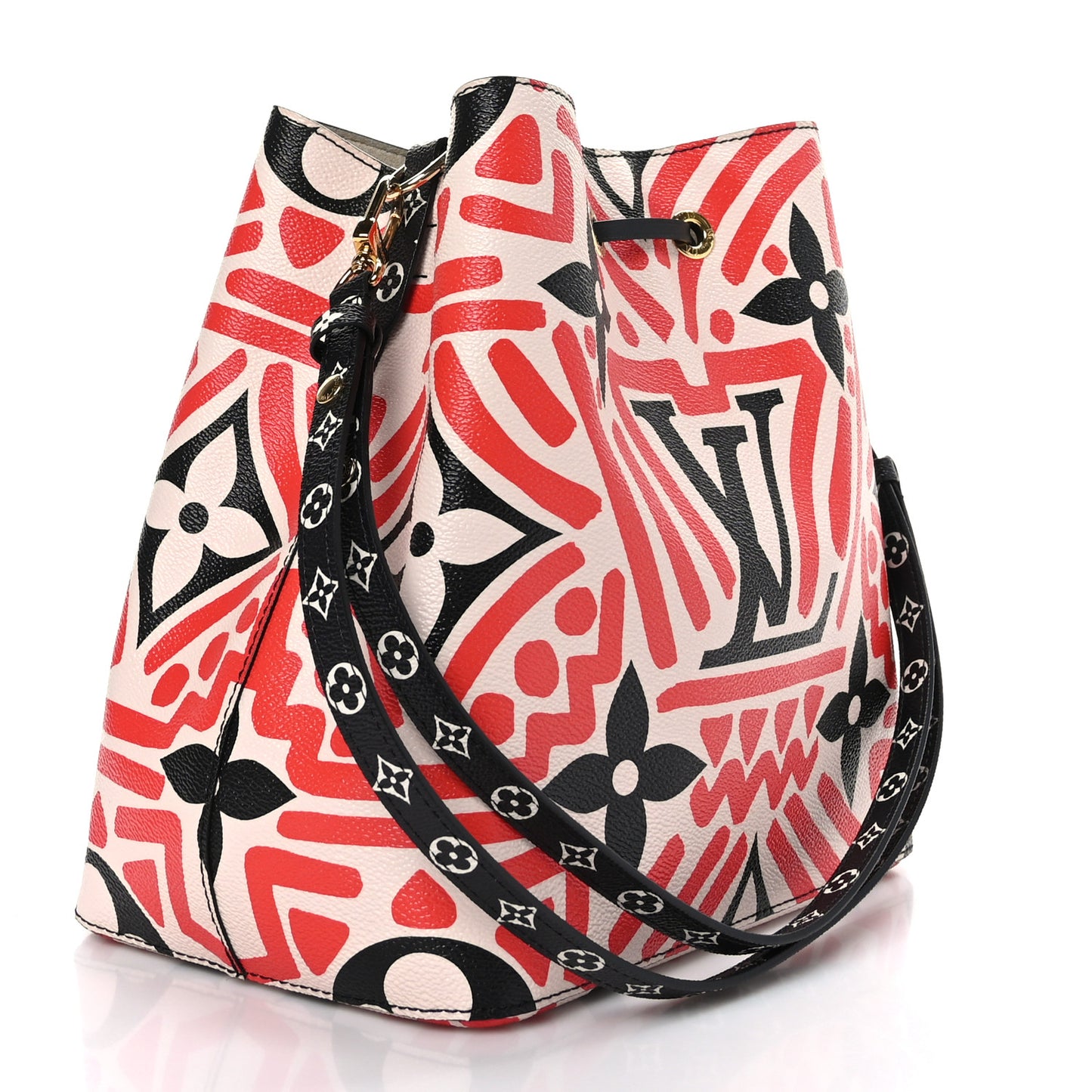This is an authentic LOUIS VUITTON Monogram Giant Crafty NeoNoe MM in Creme, Rouge, and Black. This classic bucket-style shoulder bag is crafted of Louis Vuitton monogram coated canvas. The bag features an adjustable black and white leather shoulder strap with brass hardware and a matching top cinch-cord. This opens the bag to a partitioned beige microfiber interior with a zipper compartment.Follow this item for alerts. Louis Vuitton is a registered trademark of Louis Vuitton. FASHIONPHILE is not affiliated with Louis Vuitton.