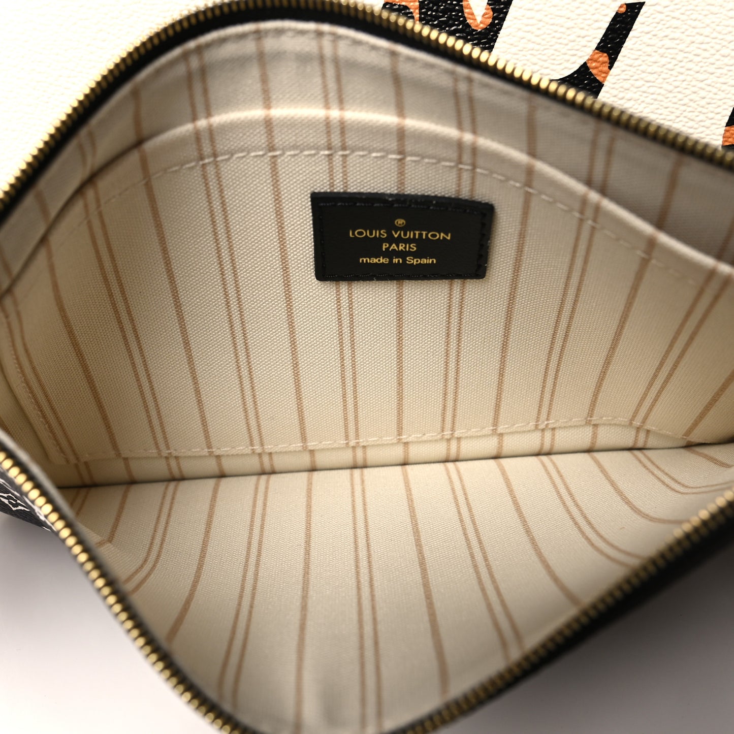 This is an authentic LOUIS VUITTON Monogram Giant Jungle Neverfull MM in Ivory. This limited edition tote features oversized and smaller sized versions of the classic Louis Vuitton monogram in an animal print with an ivory and orange coated canvas background. The bag features black and white monogrammed printed strap handles, side cinch cords and polished brass hardware. The top opens to a spacious beige striped fabric interior with a hanging zipper pocket and white on black monogram pochette.