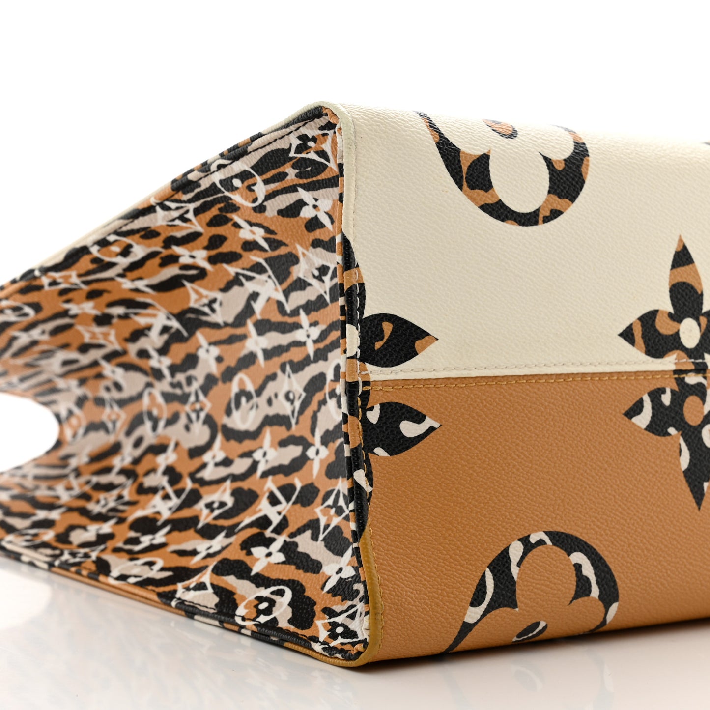 This is an authentic LOUIS VUITTON Monogram Giant Jungle Onthego GM in Ivory. This limited edition tote is crafted of oversized Louis Vuitton monogram in cheetah print on caramel brown and ivory coated canvas, with a classic monogram in orange and white on zebra and leopard print coated canvas side panels. The bag features black and white monogram rolled top handles, and matching shoulder straps that can be tucked away inside the bag. The top is open to a spacious striped ivory fabric interior with zipper and patch pockets.Follow this item for alerts. Louis Vuitton is a registered trademark of Louis Vuitton. FASHIONPHILE is not affiliated with Louis Vuitton.