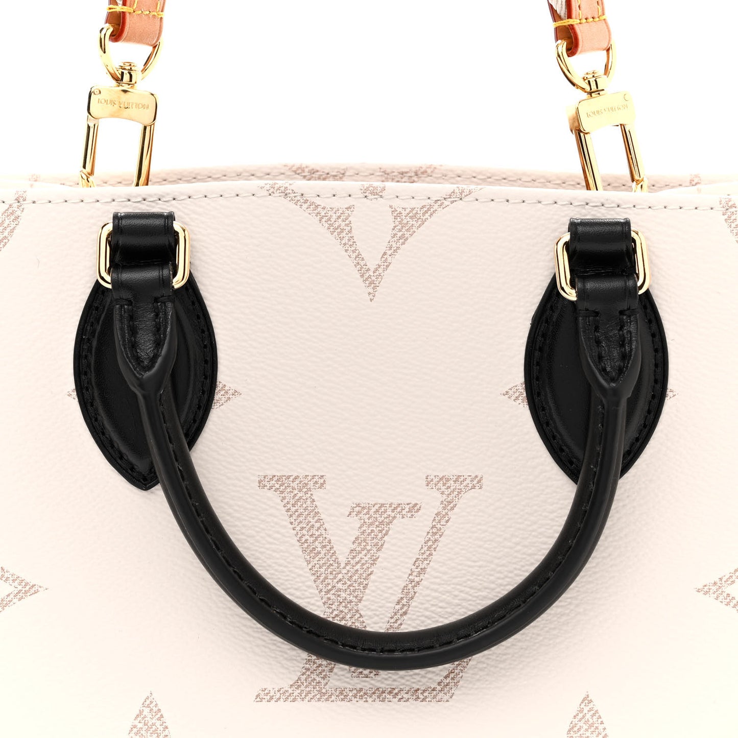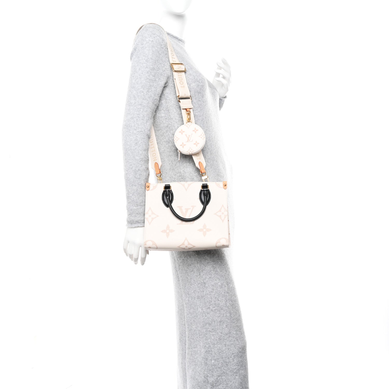 This is an authentic LOUIS VUITTON Monogram Dune Giant Onthego PM. This limited edition tote is crafted of oversized Louis Vuitton monogram on toile canvas in off white and beige. The bag features black rolled leather top handles with gold-tone hardware. The top is open to a spacious brown fabric interior with zipper and patch pockets.