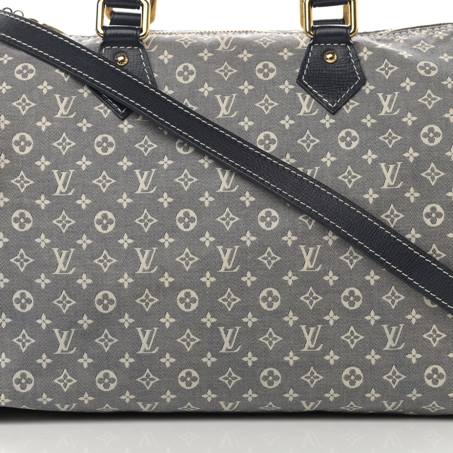 This is an authentic LOUIS VUITTON Monogram Idylle Speedy Bandouliere 30 in Encre. This Speedy is crafted of blue fabric with white mini monogram. This speedy's features include matching dark blue leather piping at the sides, an optional adjustable shoulder strap, rolled leather top handles with anchors and polished brass handle links. There is a polished gold top zipper that opens to a spacious navy blue fabric interior with patch pockets.