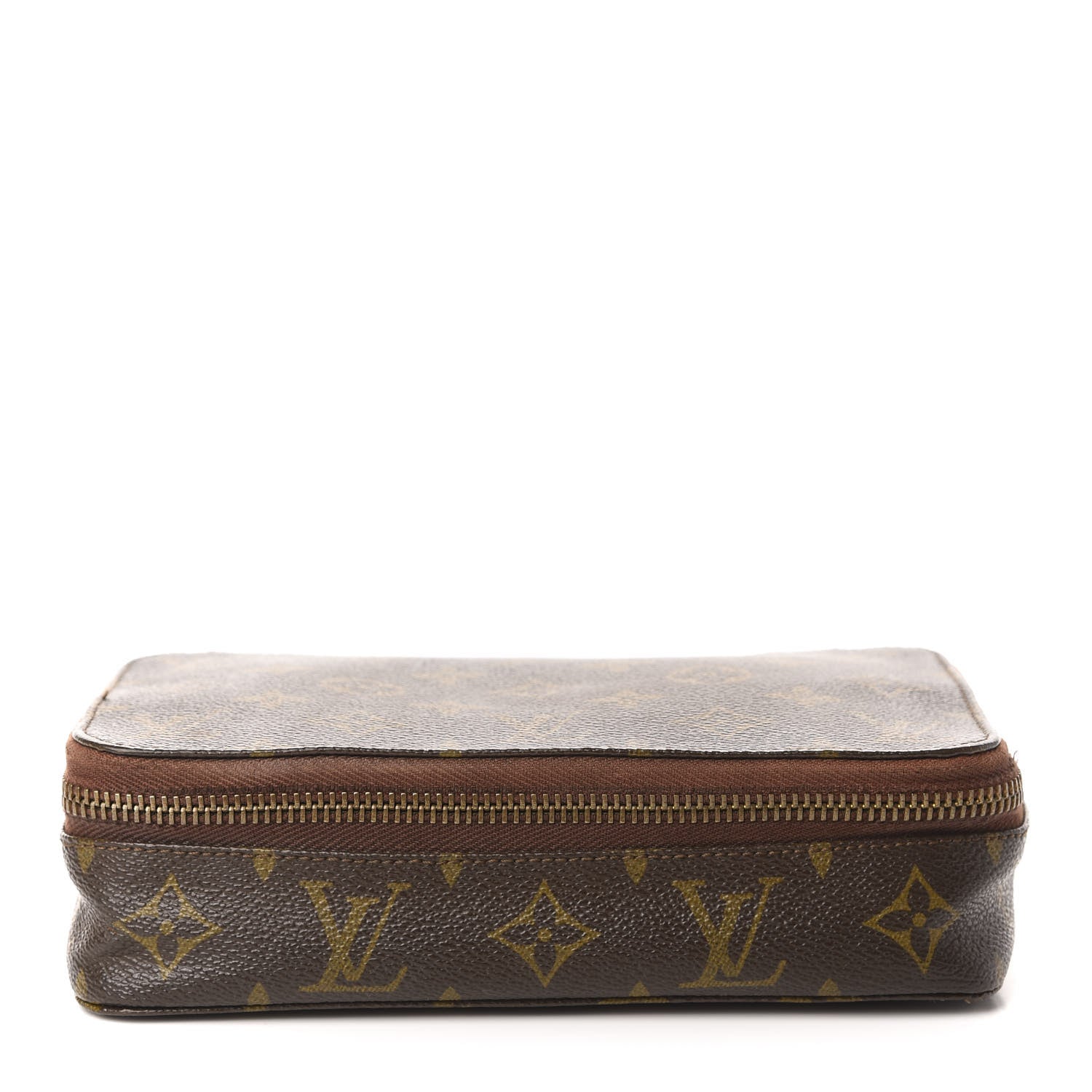 This is an authentic LOUIS VUITTON Monogram Jewelry Case. This stylish jewelry case is crafted of monogram coated canvas with brass hardware. The wrap-around zipper opens to a microfiber interior with an attached three zip compartment pouch and straps for holding jewelry. This is an ideal jewelry case for home or travel, from Louis Vuitton!Follow this item for alerts. Louis Vuitton is a registered trademark of Louis Vuitton. FASHIONPHILE is not affiliated with Louis Vuitton.