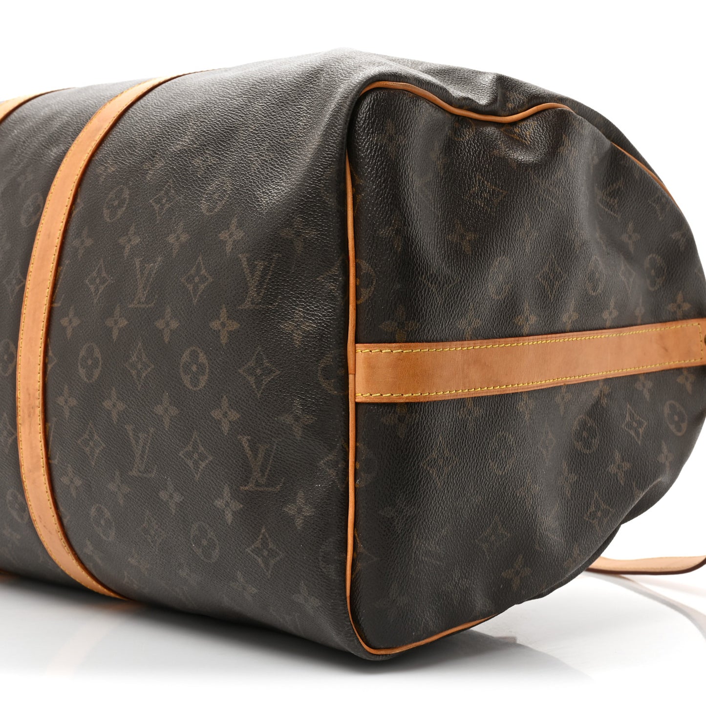 This is an authentic LOUIS VUITTON Monogram Keepall Bandouliere 55. This bag is crafted of signature Louis Vuitton monogram on toile coated dark brown canvas. The bag features a vachetta cowhide leather trim, rolled top handles, and polished gold hardware. The top zipper opens the bag to a spacious cocoa brown fabric interior.Follow this item for alerts. Louis Vuitton is a registered trademark of Louis Vuitton. FASHIONPHILE is not affiliated with Louis Vuitton.