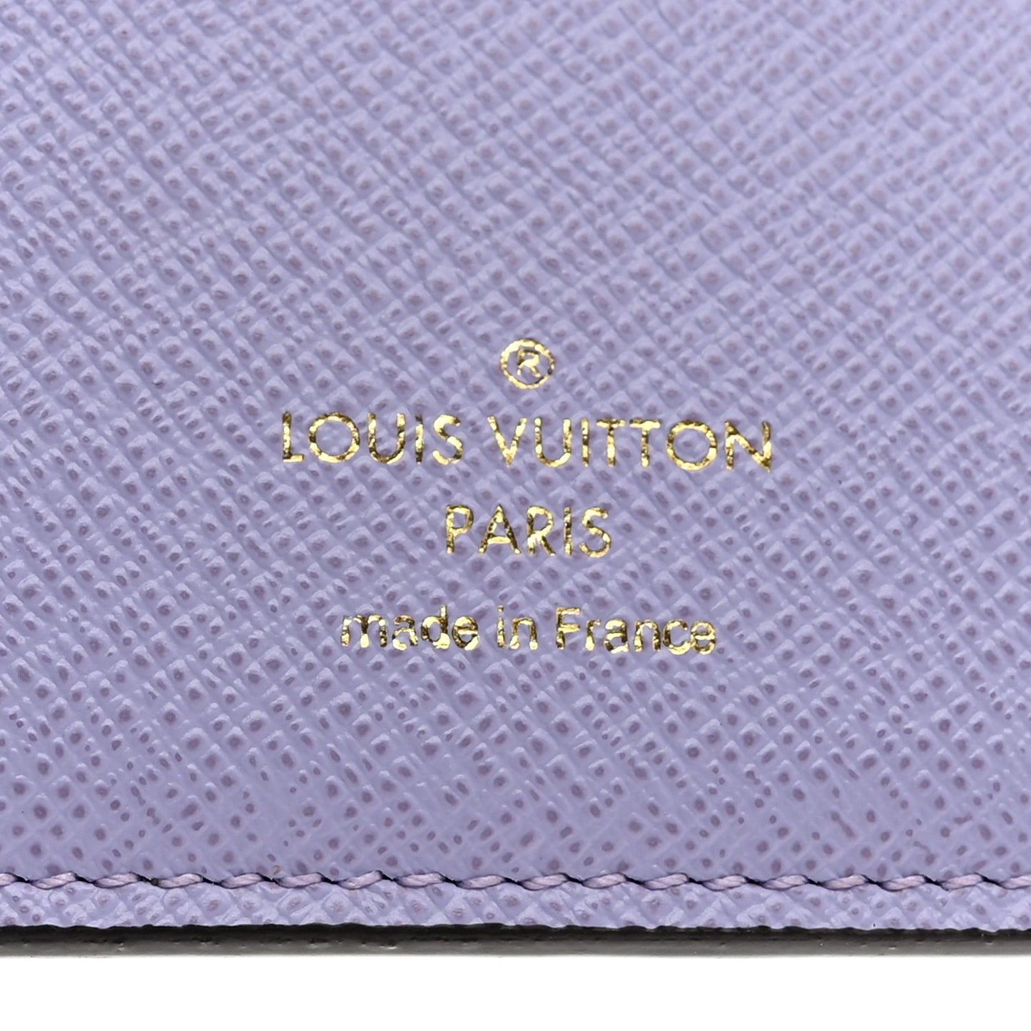 This authentic LOUIS VUITTON Monogram Lisa Wallet in Iris. This wallet is crafted from monogram coated canvas with a gold tone snap closure. It opens to a purple cross-grained leather interior with 4 card slots, 2 flat pockets, a bill fold, and a zipper pocket.