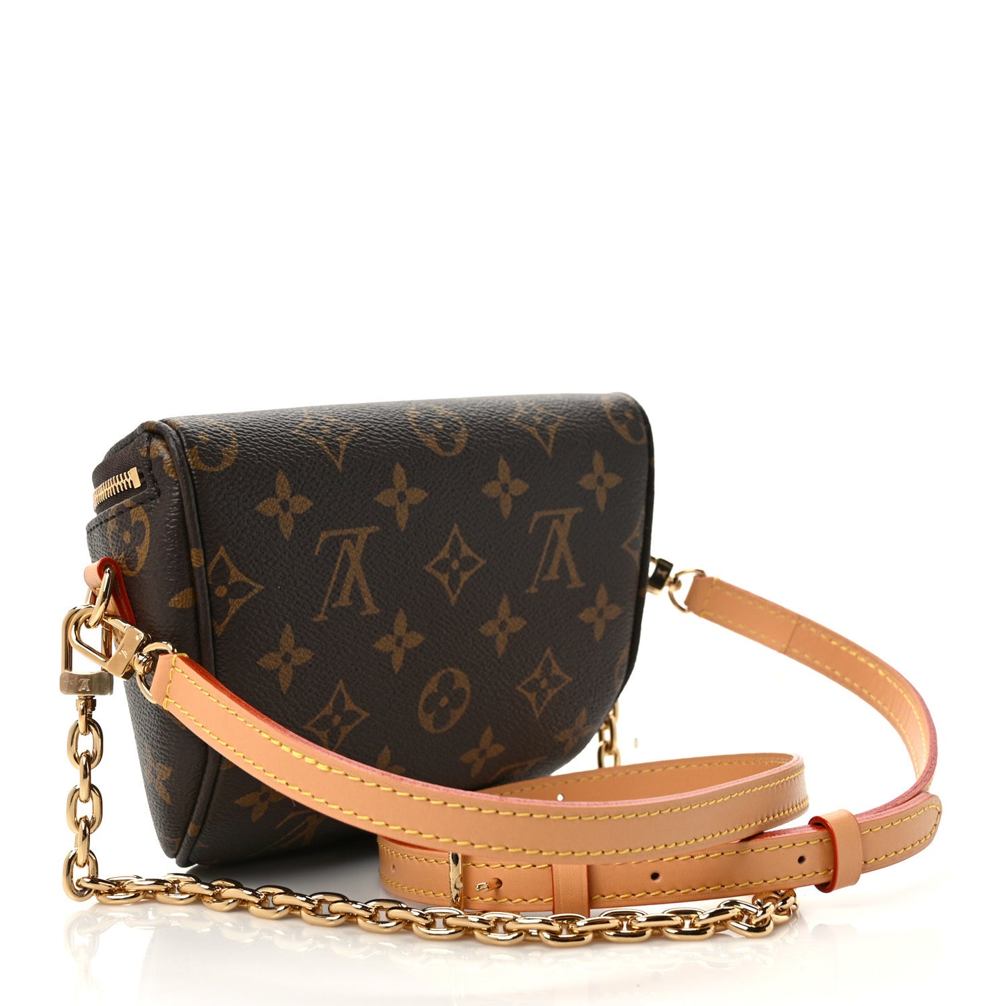 This is an authentic LOUIS VUITTON Monogram Mini Bumbag. This stylish belt bag is created out of a traditional Louis Vuitton monogram on coated canvas. The bag features an optional vachetta cowhide adjustable leather shoulder strap, and a removable short gold chain shorts strap. The main zipper opens to a brown fabric interior.Follow this item for alerts. Louis Vuitton is a registered trademark of Louis Vuitton. FASHIONPHILE is not affiliated with Louis Vuitton.