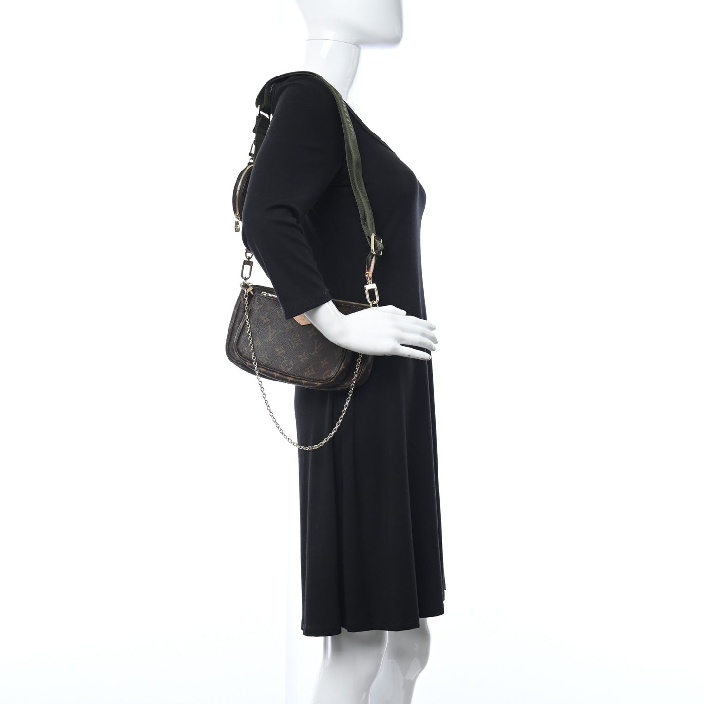 This is an authentic LOUIS VUITTON Monogram Multi Pochette Accessories in Kaki. This hybrid crossbody bag is crafted of classic and mini monogram coated canvas in brown. It features a pochette accessories, a mini pochette accessories, and a round coin purse. It has both a removable brass chain strap and an adjustable khaki-green Louis Vuitton inscribed jacquard strap for multiple carrying options. The pochettes open to a cocoa brown fabric interior.Follow this item for alerts. Louis Vuitton is a registered trademark of Louis Vuitton. FASHIONPHILE is not affiliated with Louis Vuitton.