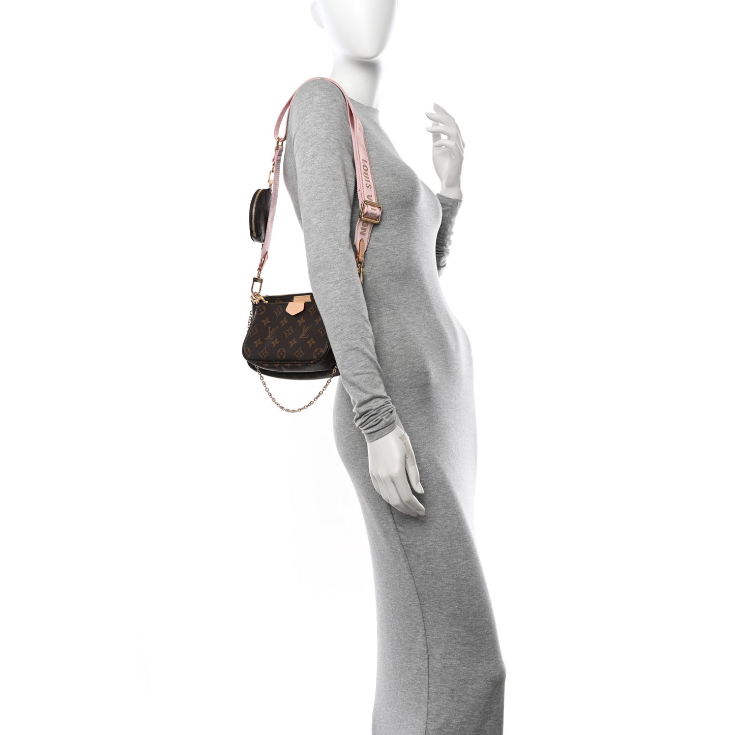 This is an authentic LOUIS VUITTON Monogram Multi Pochette Accessories in Rose Clair. This hybrid crossbody bag is crafted of monogram and mini monogram canvas in brown. The set features a pochette accessoires, a mini pochette, an adjustable pink jacquard shoulder strap with removable coin purse, and a chain strap for added versatility. The pochettes open to brown fabric interiors. The coin purse opens to an ivory crossgrain leather interior.