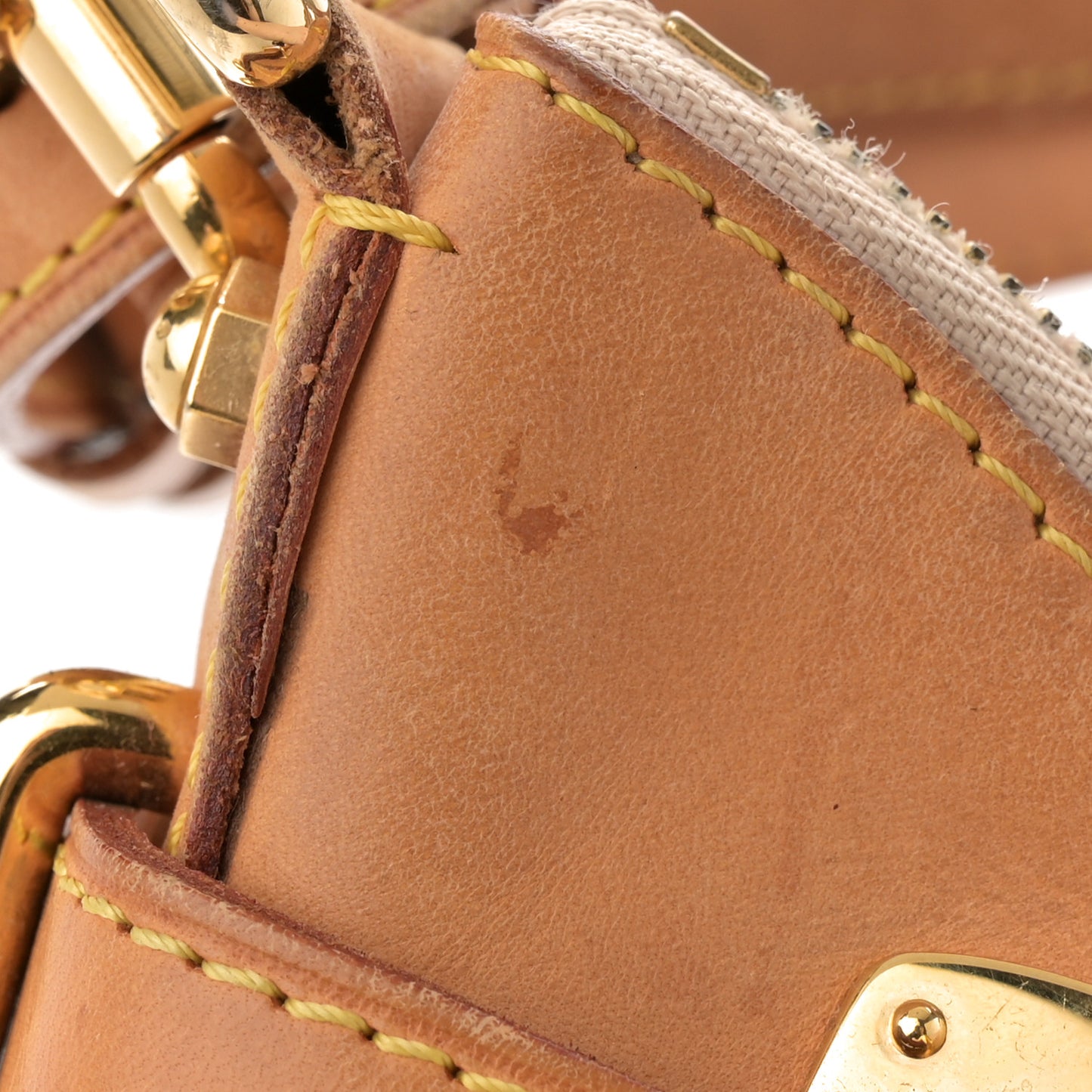 Exterior: Corner wear, scuffs, patina of vachetta, edge wear, liquid marks