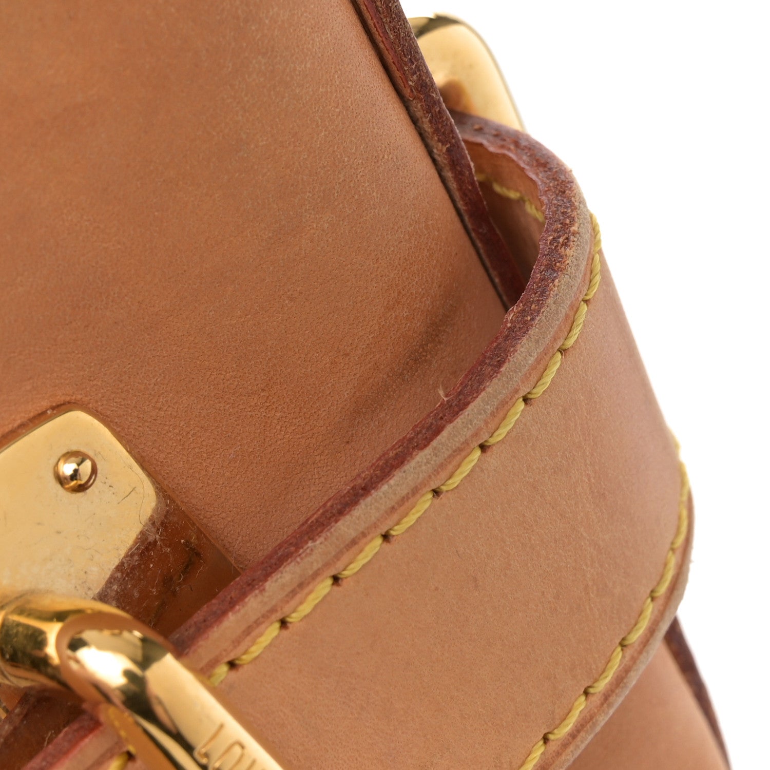 Handle: Creases, scuffs, wear at resin glazing, darkening, patina of vachetta