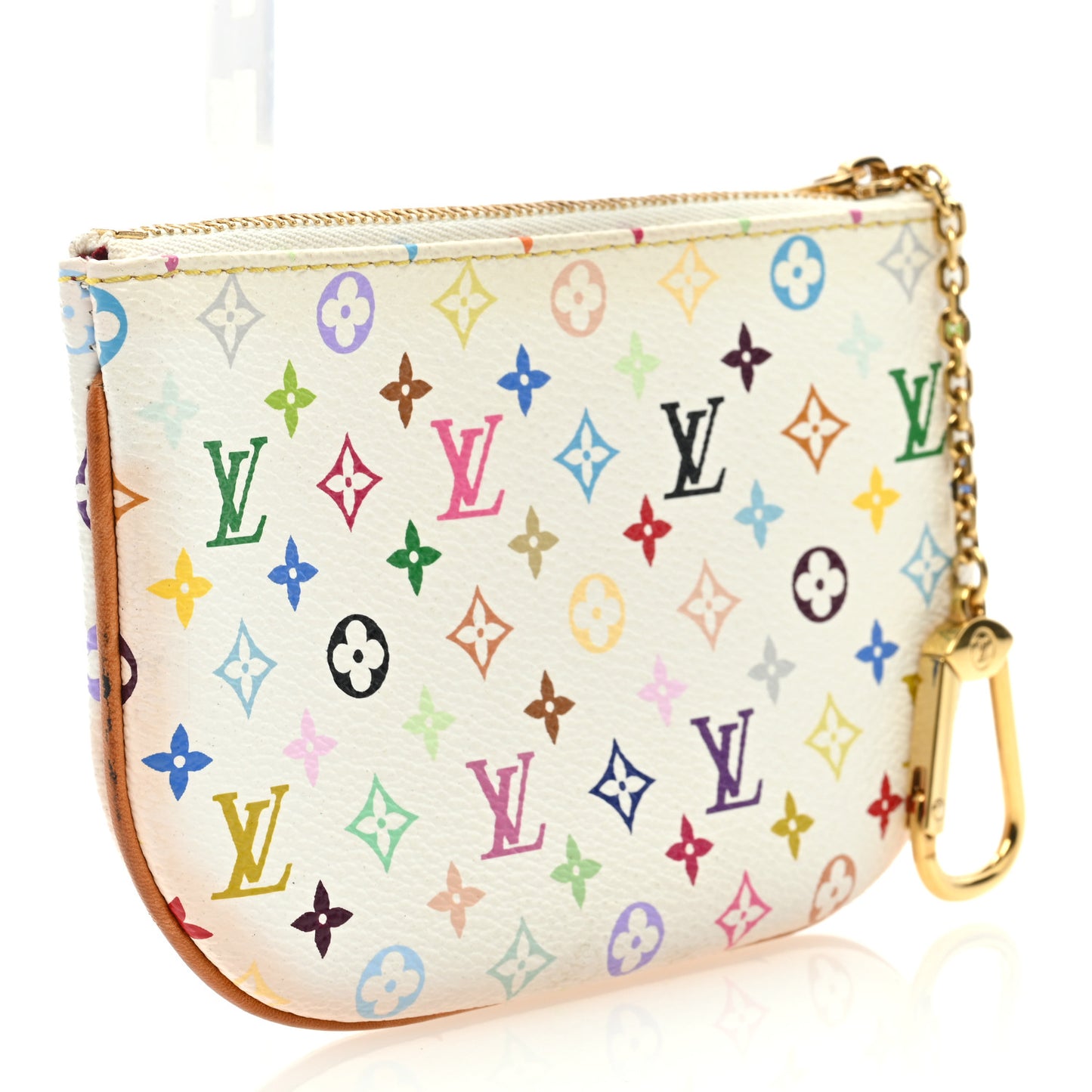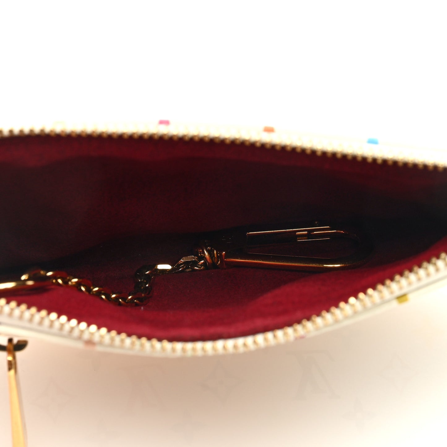 This is an authentic LOUIS VUITTON Multicolor Pochette Plate MM in White. This flat accessory pouch is crafted of multicolor coated canvas. It features a rounded bottom with vachetta leather piping and trim for the facing zipper pocket. The top zipper opens to a rouge red microfiber lining with a gold-tone removable chain strap.