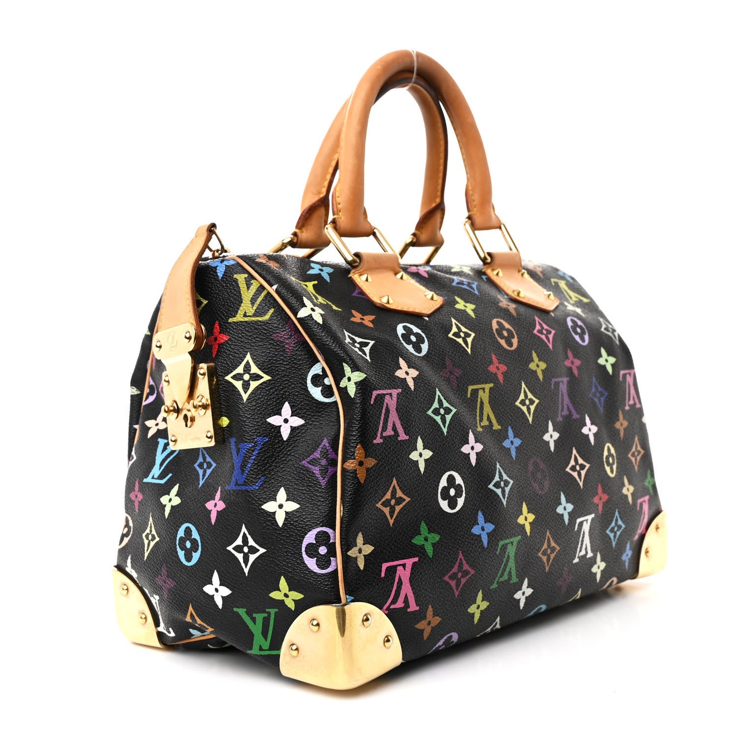 This is an authentic LOUIS VUITTON Monogram Multicolor Speedy 30 in Black. This speedy tote is crafted of Louis Vuitton Multicolore monogram in 33 vivid colors on black toile canvas. This handbag features vachetta cowhide leather rolled handles and polished brass hardware including durable handle rings, a press lock on the exterior flap pocket, and four sturdy base corner plates. The top zipper opens to an interior of brown microfiber with a patch pocket.Follow this item for alerts. Louis Vuitton is a registered trademark of Louis Vuitton. FASHIONPHILE is not affiliated with Louis Vuitton.