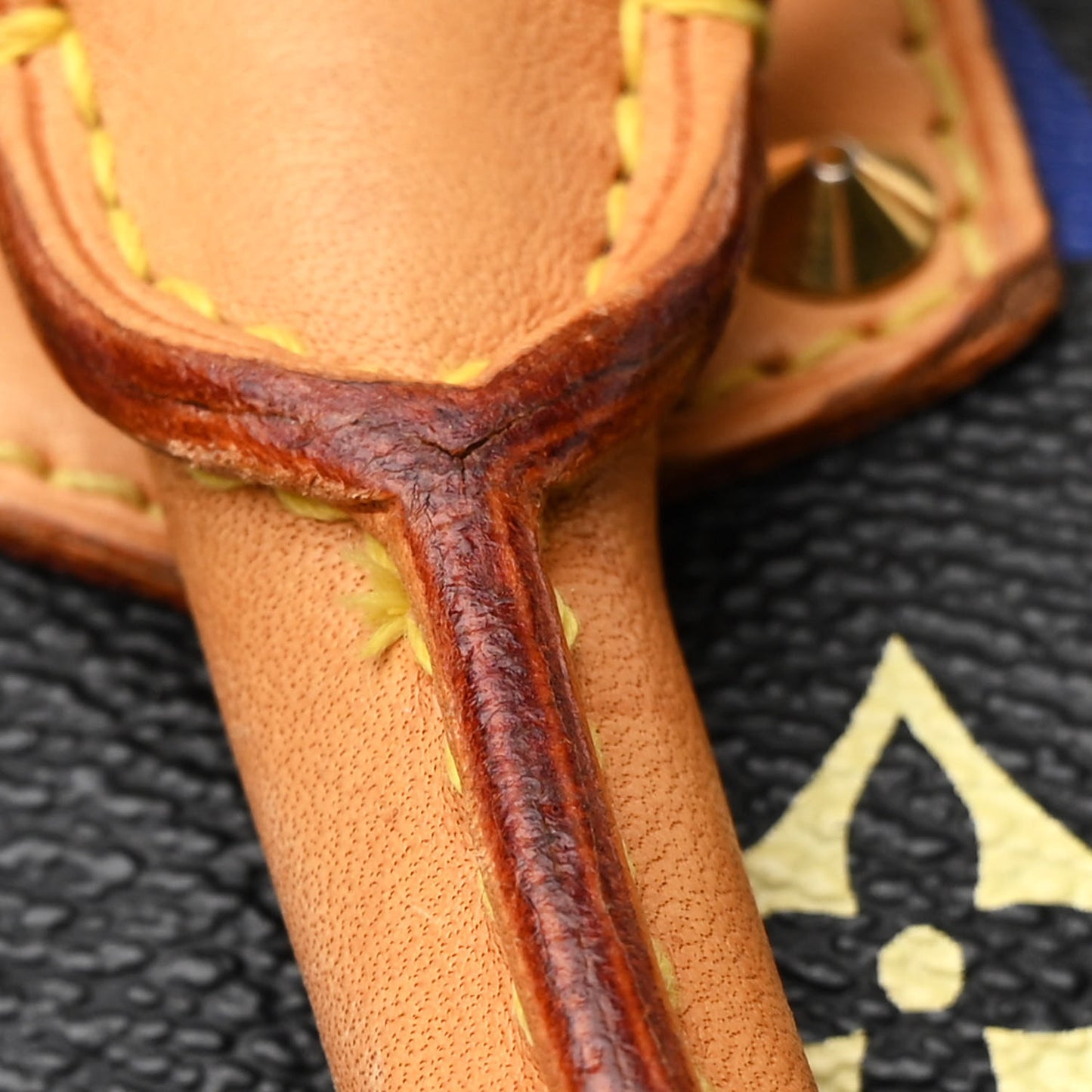 Handle: Surface wear, smoothing of leather, scuffs, wear at resin glazing, patina of vachetta, liquid marks