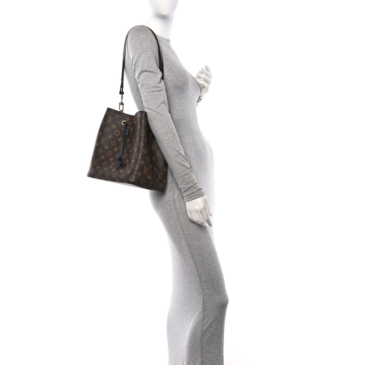 This is an authentic LOUIS VUITTON Monogram Neonoe MM in Black. This classic bucket style shoulder bag is crafted of Louis Vuitton monogram coated canvas in dark brown. The bag features a black leather top cinch cord, adjustable leather shoulder strap, and polished gold-toned hardware. The top opens to a black microfiber interior with a center zipper compartment.Follow this item for alerts. Louis Vuitton is a registered trademark of Louis Vuitton. FASHIONPHILE is not affiliated with Louis Vuitton.