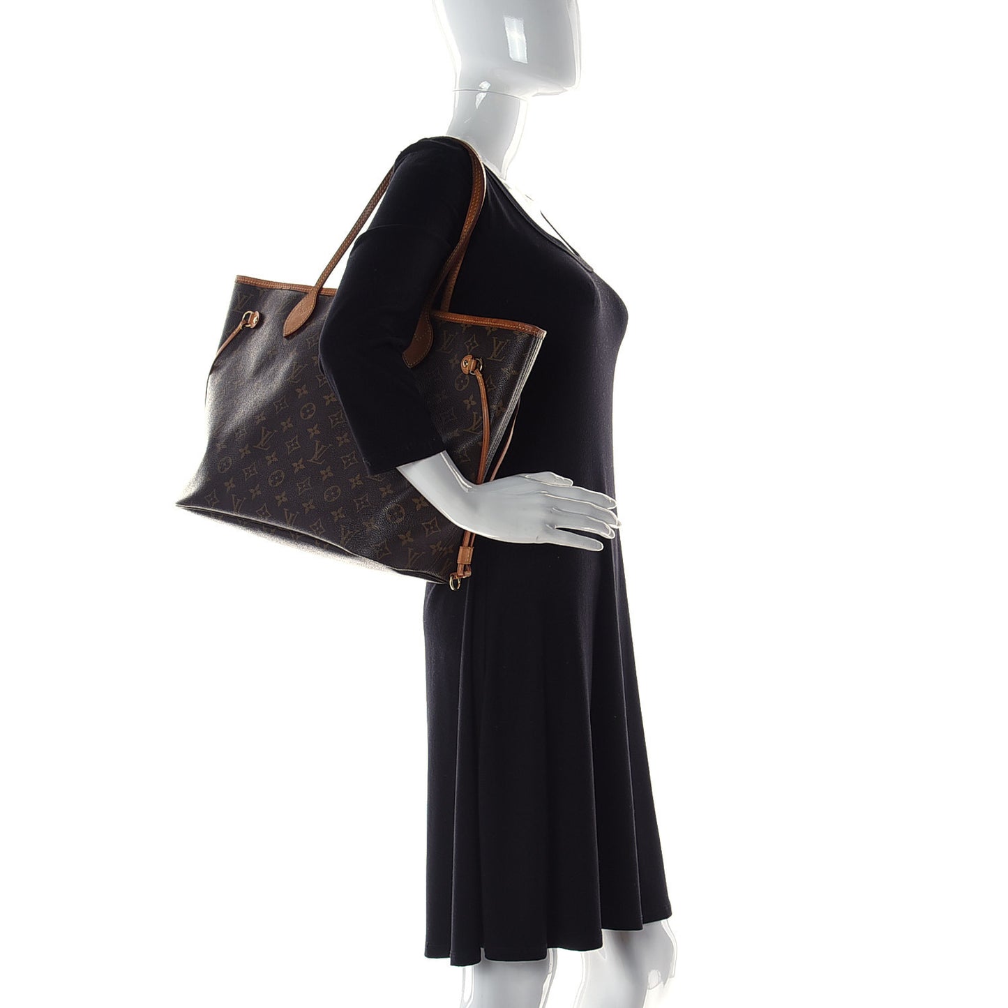 This is an authentic LOUIS VUITTON Monogram Neverfull MM. This stylish tote is crafted of classic Louis Vuitton monogram coated canvas. It features vachetta cowhide leather trim, handles, and side cinch cords with polished brass hardware. The top is open to a beige striped fabric interior with a hanging zipper pocket.Follow this item for alerts. Louis Vuitton is a registered trademark of Louis Vuitton. FASHIONPHILE is not affiliated with Louis Vuitton.