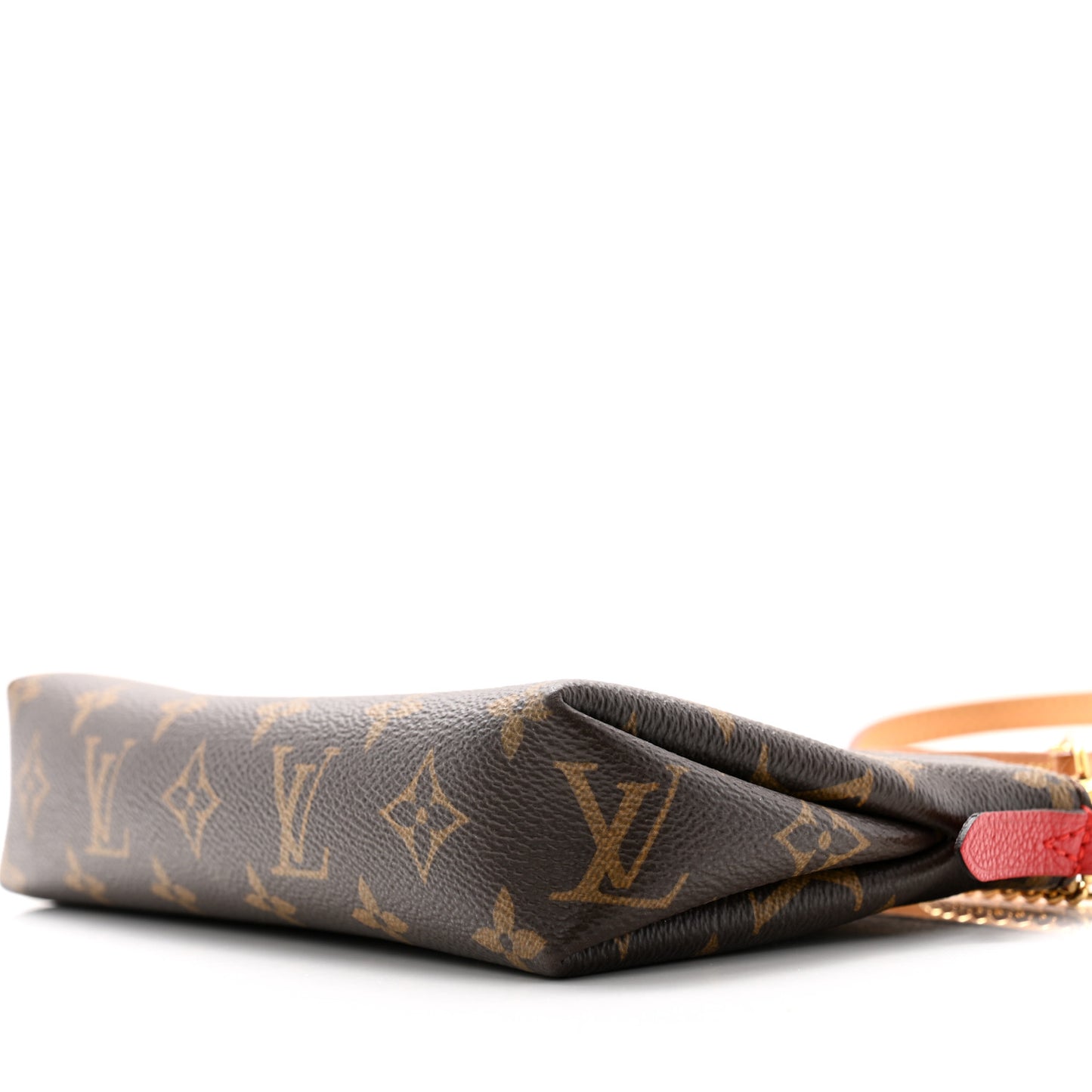 This is an authentic LOUIS VUITTON Monogram Pallas Clutch in Cherry. This chic shoulder bag is crafted of Louis Vuitton monogram coated canvas with a trim of red leather. The bag features a front pocket, a polished gold chain link strap, and a vachetta leather detachable strap. The top zipper opens to a red fabric interior with a patch pocket.Follow this item for alerts. Louis Vuitton is a registered trademark of Louis Vuitton. FASHIONPHILE is not affiliated with Louis Vuitton.