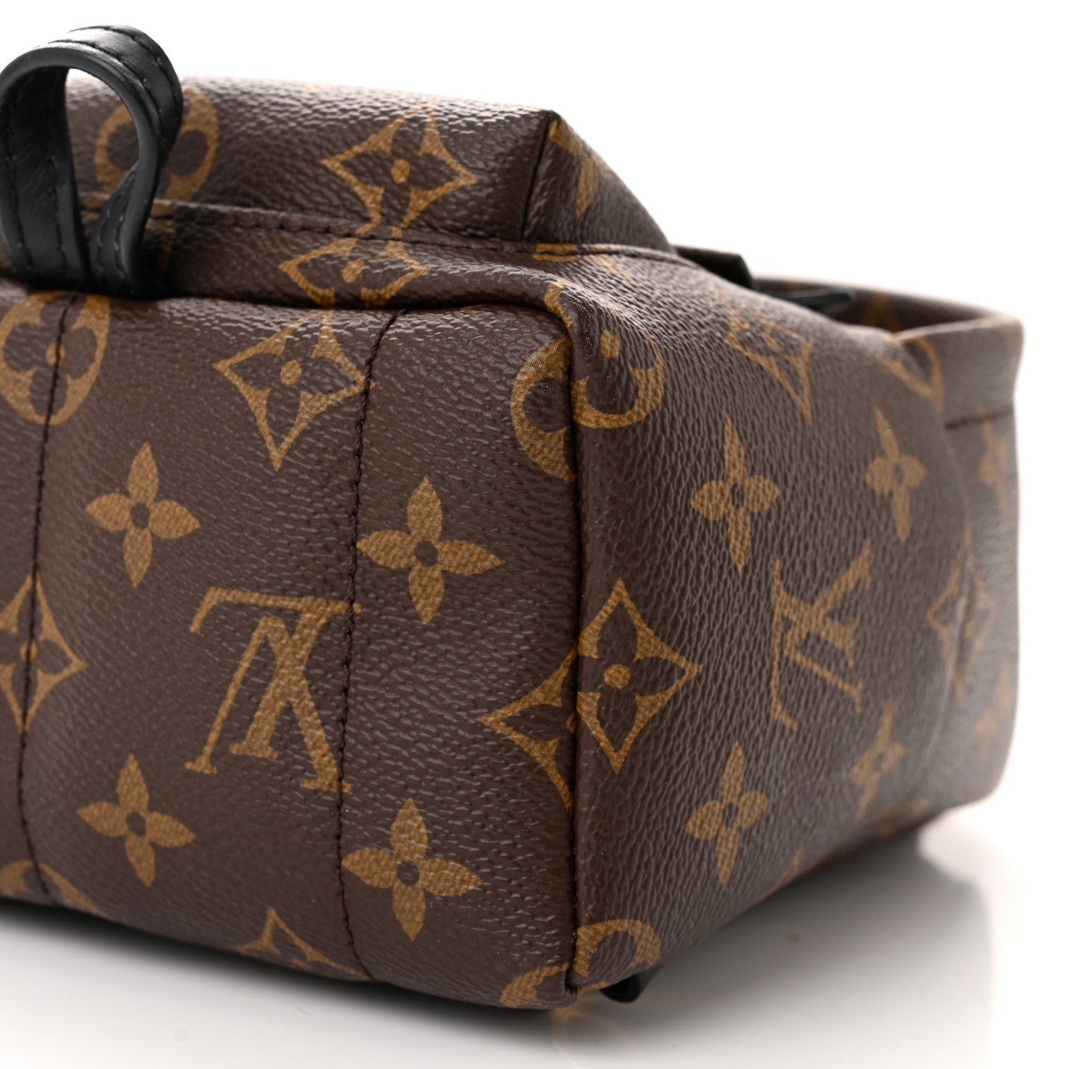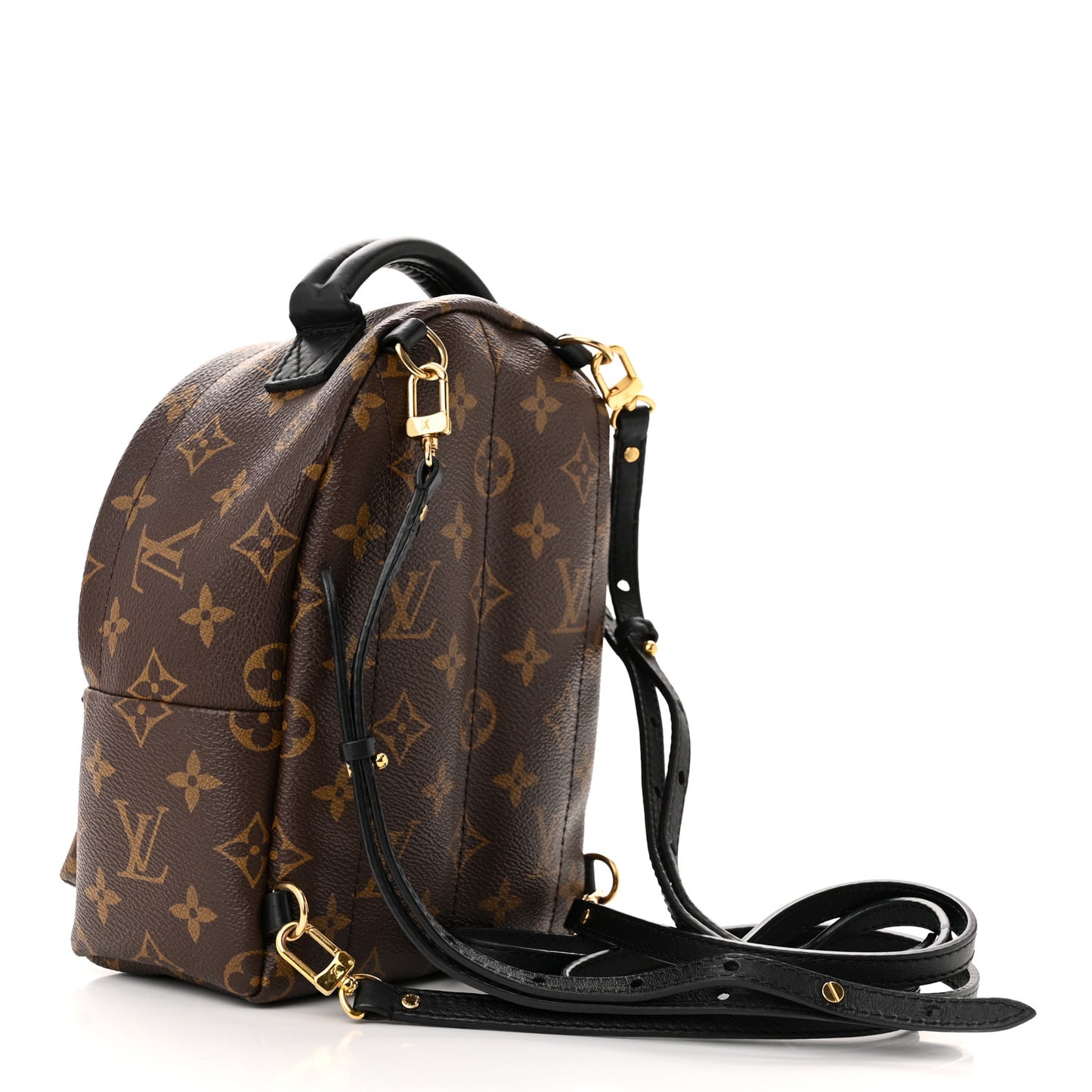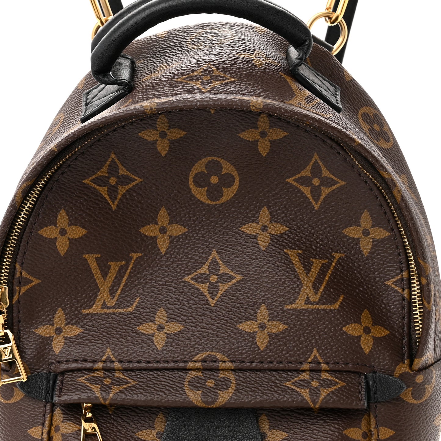 This is the authentic LOUIS VUITTON Monogram Palm Springs Backpack Mini. This petite backpack is crafted of classic monogram coated dark brown canvas with black calfskin leather trim. The backpack features a padded black leather top handle, removable adjustable shoulder straps, and a front zipper pocket. The brass wrap-around zipper opens to a black fabric interior with a patch pocket.Follow this item for alerts. Louis Vuitton is a registered trademark of Louis Vuitton. FASHIONPHILE is not affiliated with Louis Vuitton.