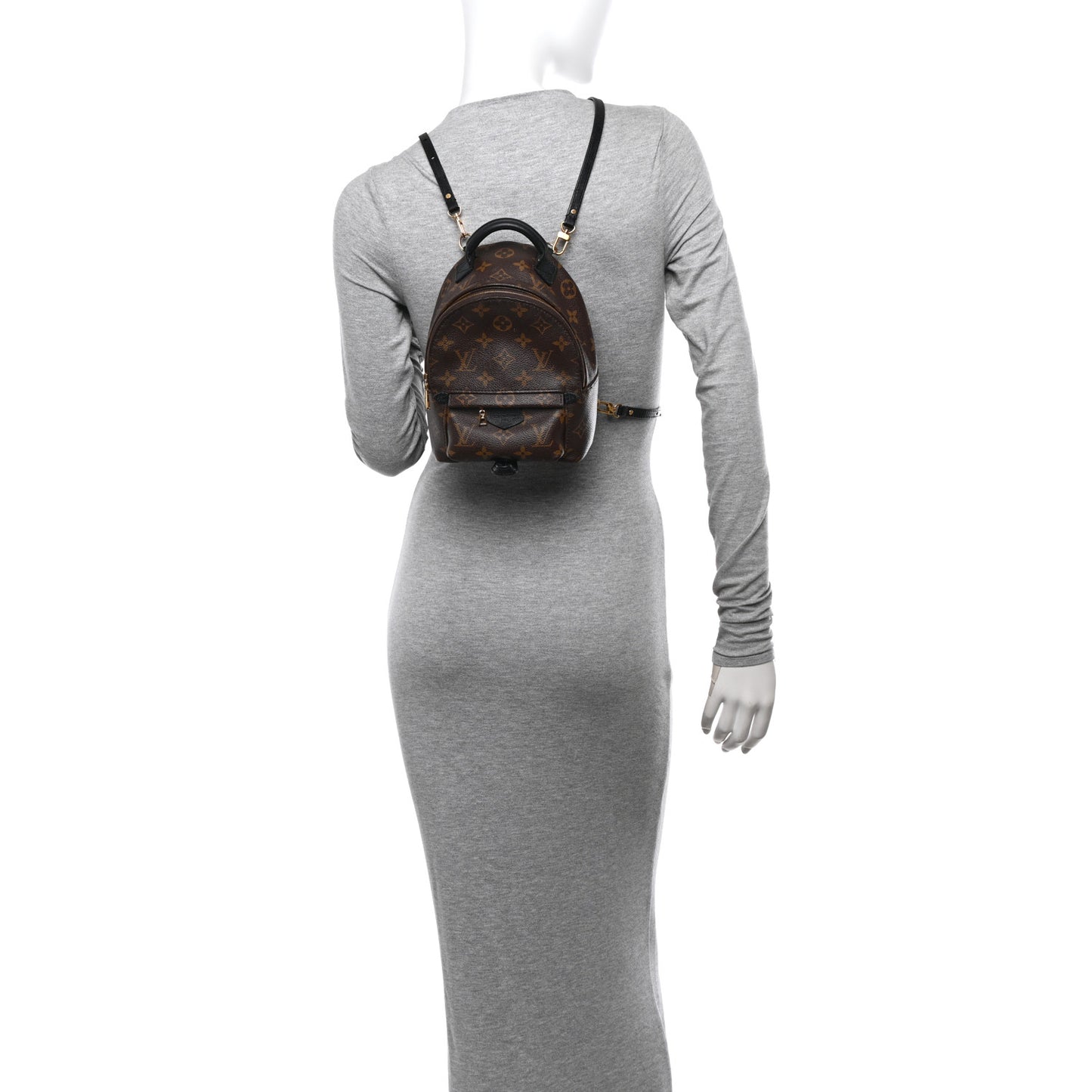 This is the authentic LOUIS VUITTON Monogram Palm Springs Backpack Mini. This petite backpack is crafted of classic monogram coated dark brown canvas, with black calfskin leather trim. The backpack features a padded black leather top handle, removable adjustable shoulder straps, and a front zipper pocket. The brass wrap-around zipper opens to a black fabric interior with a patch pocket.Follow this item for alerts. Louis Vuitton is a registered trademark of Louis Vuitton. FASHIONPHILE is not affiliated with Louis Vuitton.