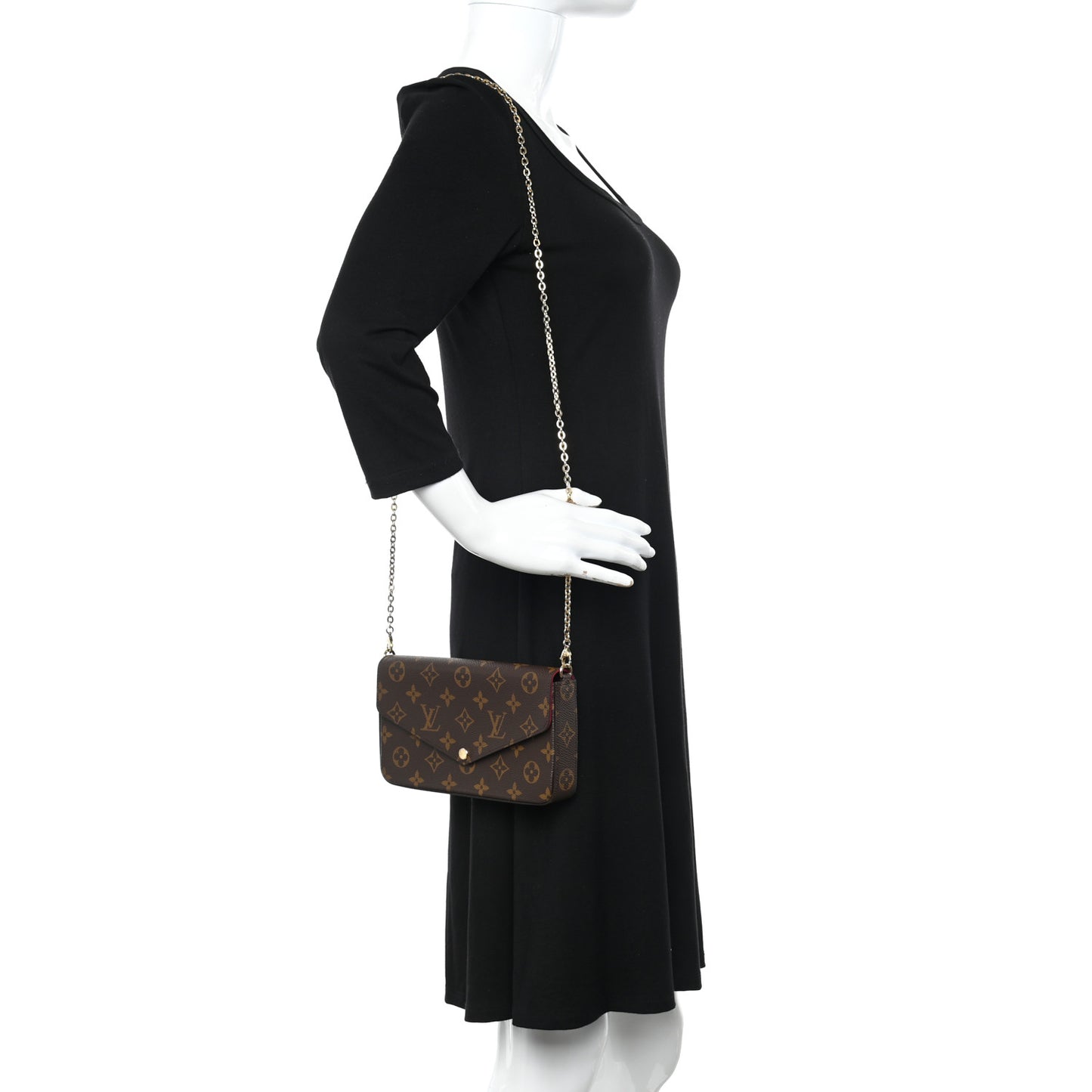 This is an authentic LOUIS VUITTON Monogram Pochette Felicie Chain Wallet in Fuchsia. This wallet is crafted in Louis Vuitton monogram toile dark brown coated canvas. The bag features an envelope style facing flap and a gold detachable shoulder strap. This opens to a fuchsia fabric interior with a patch pocket and two inserts.Follow this item for alerts. Louis Vuitton is a registered trademark of Louis Vuitton. FASHIONPHILE is not affiliated with Louis Vuitton.
