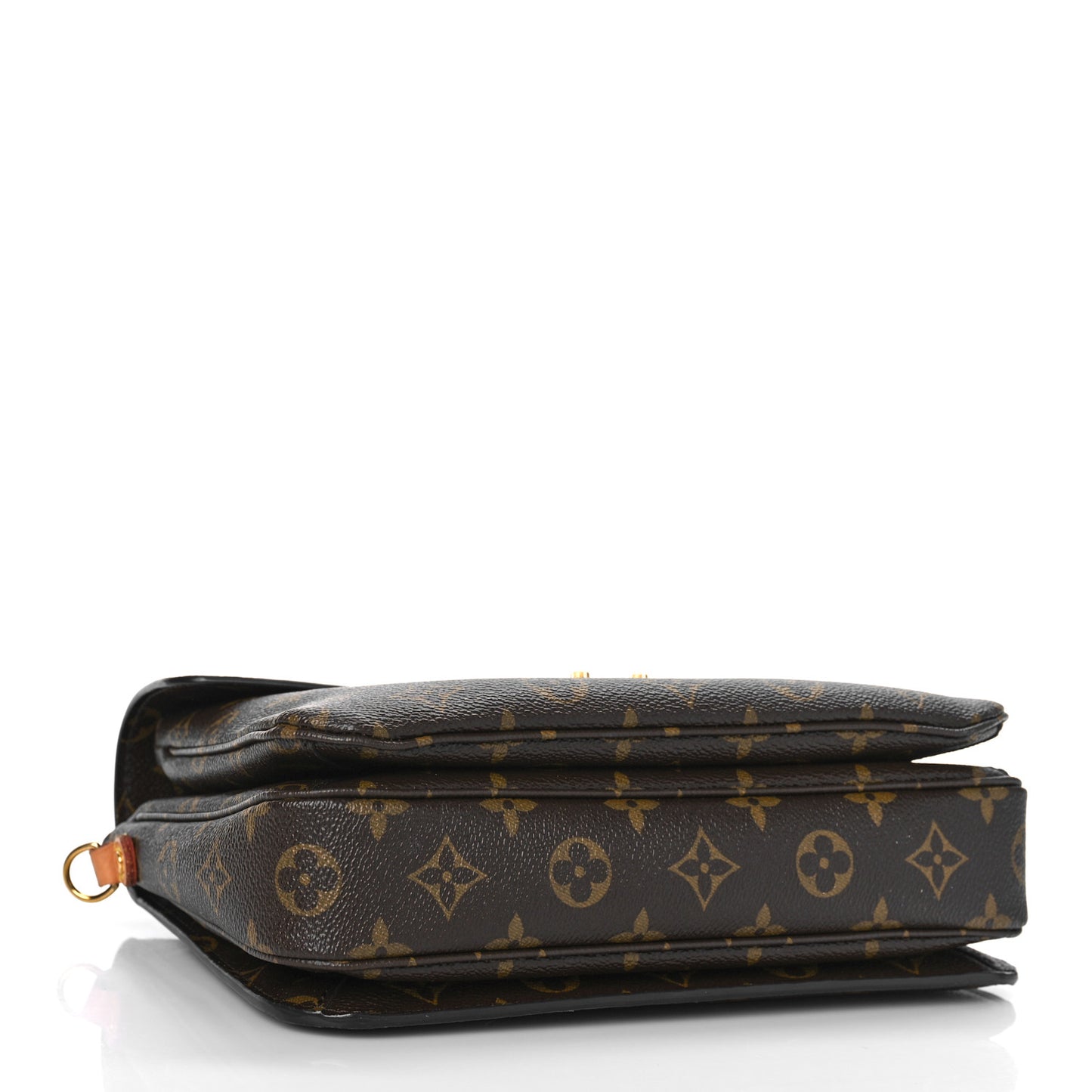 This is an authentic LOUIS VUITTON Monogram Pochette Metis. This chic handbag is finely crafted of classic Louis Vuitton monogram toile canvas. The shoulder bag features a vachetta cowhide leather handle, an optional adjustable monogram canvas shoulder strap, a rear exterior zipper pocket, and a V-shaped front flap with a polished brass S-lock. The flap opens to a partitioned brown microfiber interior.