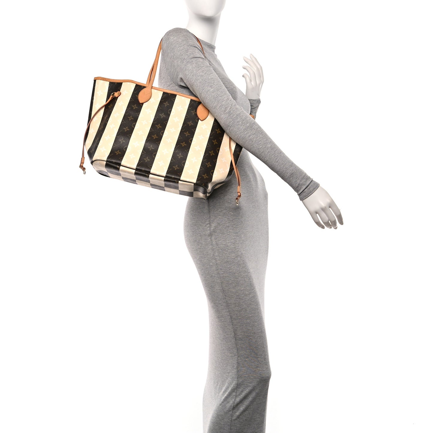 This is an authentic LOUIS VUITTON Monogram Rayures Neverfull MM. This chic tote is finely crafted of Louis Vuitton monogram on brown and beige striped toile coated canvas. The shoulder bag features vachetta cowhide leather shoulder straps, side cinch cords, and trim with polished gold hardware. The top opens to a beige striped fabric interior with a hanging zipper pocket.Follow this item for alerts. Louis Vuitton is a registered trademark of Louis Vuitton. FASHIONPHILE is not affiliated with Louis Vuitton.