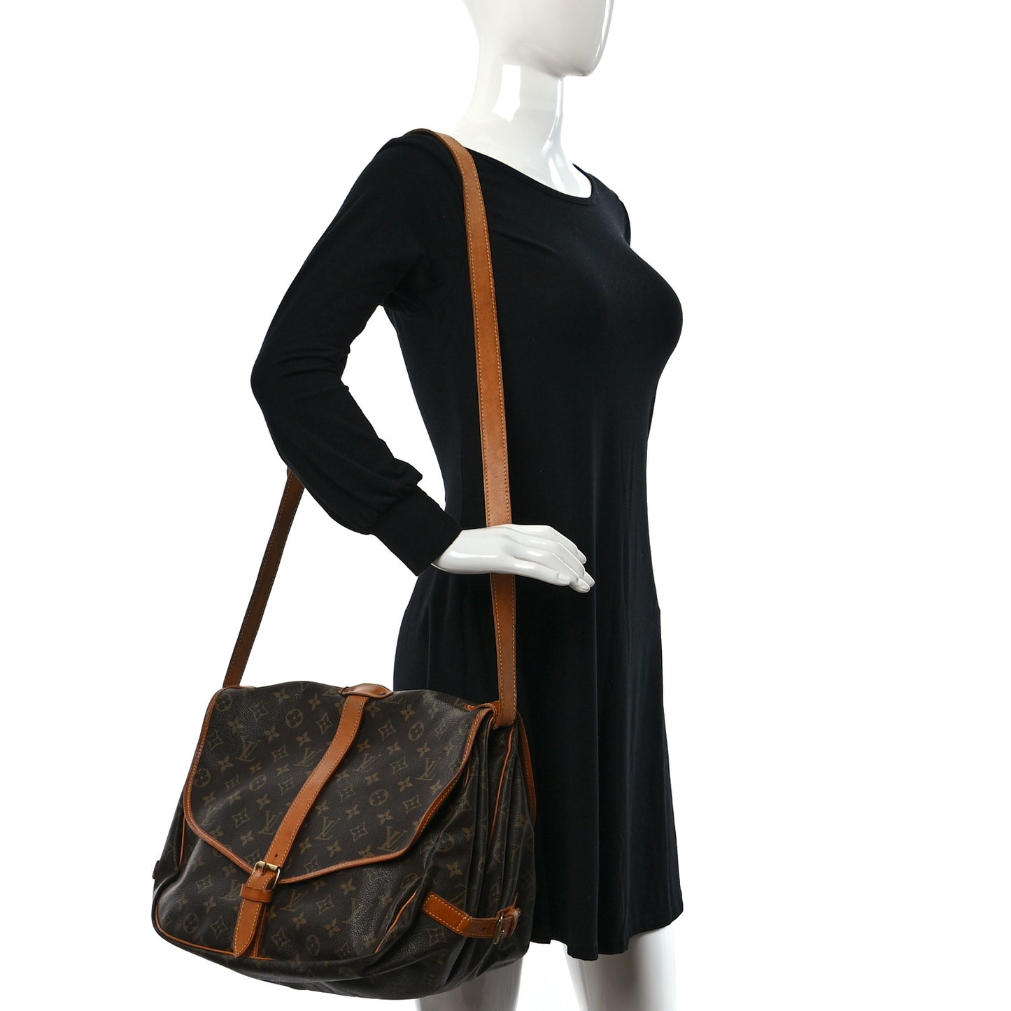 This is an authentic LOUIS VUITTON Monogram Saumur 35. This saddle-style messenger bag is crafted of classic Louis Vuitton monogram on toile canvas. The bag features vachetta cowhide leather trim, side belt buckle cinches, an adjustable shoulder strap, and a belt buckle closure on each flap. The bag opens to a cocoa brown fabric interior with patch pockets.Follow this item for alerts. Louis Vuitton is a registered trademark of Louis Vuitton. FASHIONPHILE is not affiliated with Louis Vuitton.