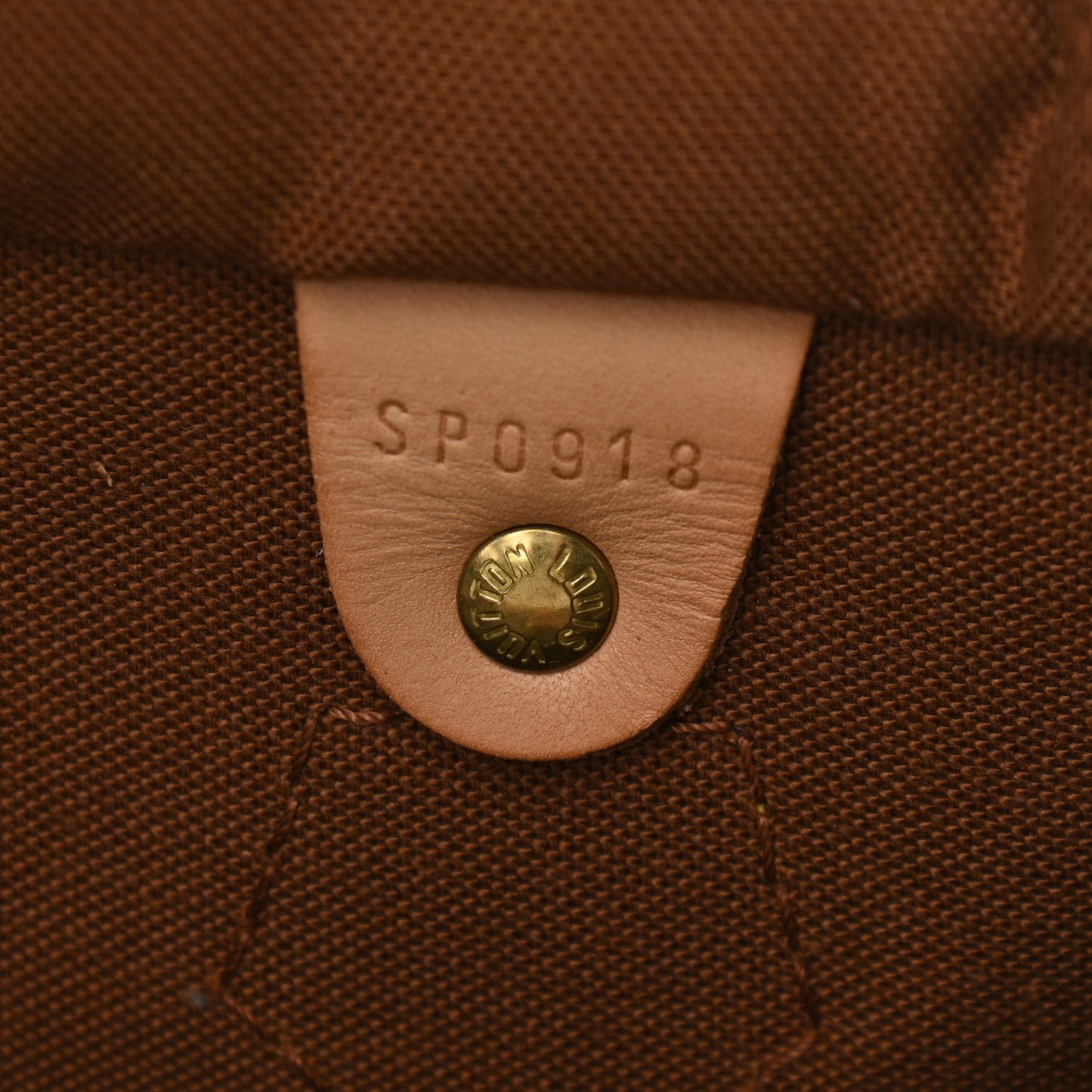 This is an authentic LOUIS VUITTON Monogram Speedy 30. This classic handbag is finely crafted of traditional Louis Vuitton monogram coated canvas. The bag features vachetta cowhide leather trim and rolled top handles with brass hardware. The top zipper opens the bag to a cocoa brown fabric interior with a pocket.Follow this item for alerts. Louis Vuitton is a registered trademark of Louis Vuitton. FASHIONPHILE is not affiliated with Louis Vuitton.