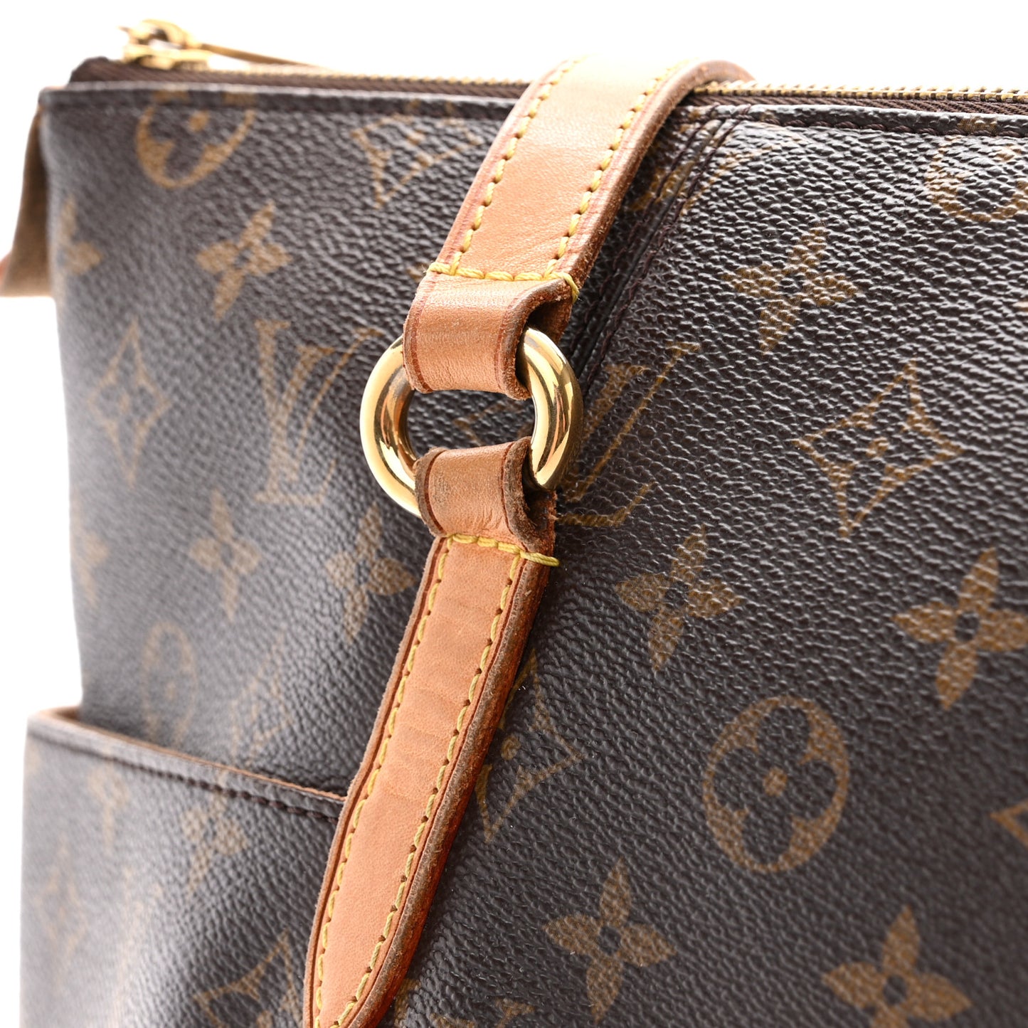 This is an authentic LOUIS VUITTON Monogram Totally MM. This tote is crafted of classic Louis Vuitton monogram-coated canvas. The bag features bucket pockets on either side, and vachetta cowhide leather trim and shoulder straps, with gold plated hardware. The top zipper opens the bag to a cocoa brown fabric interior with patch pockets.