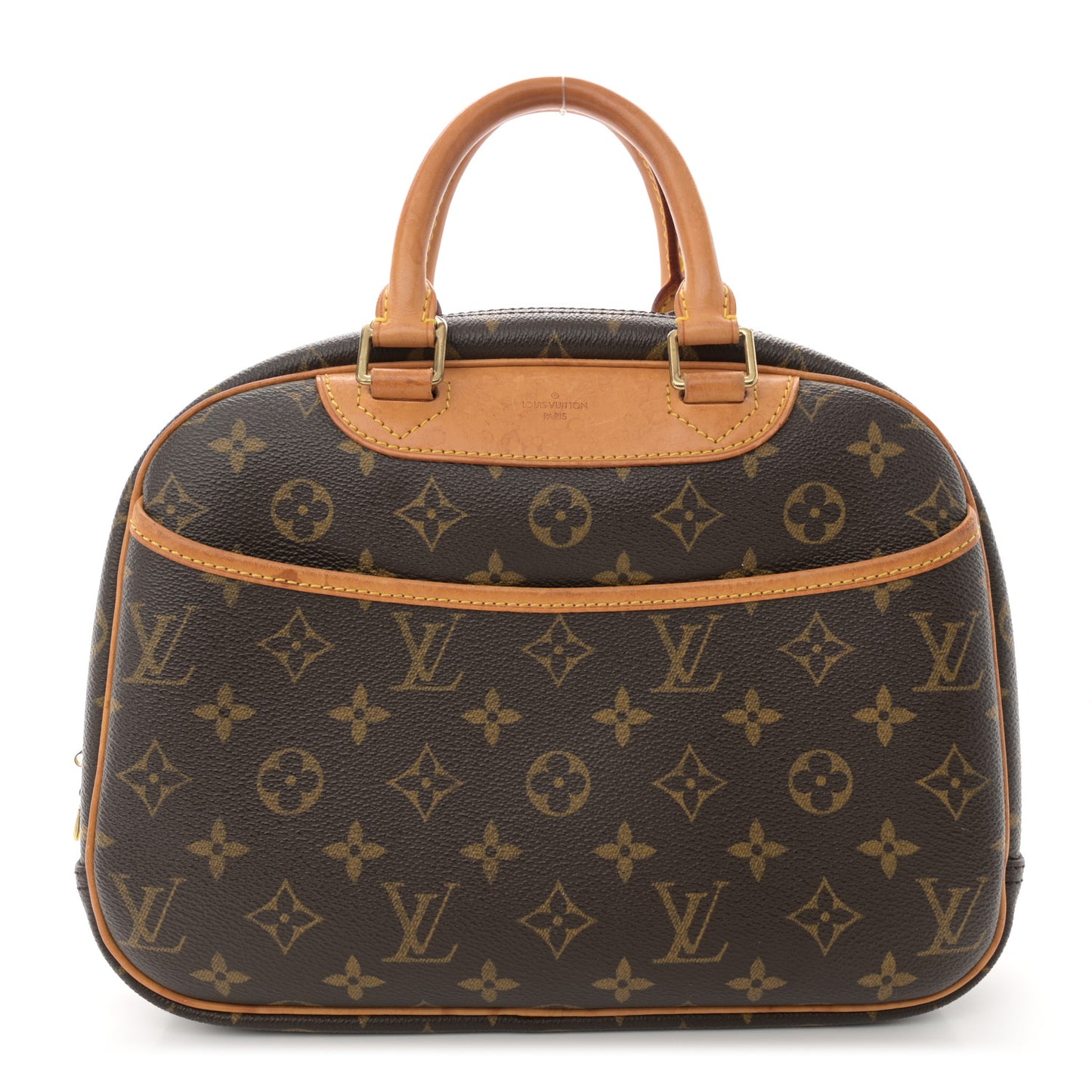 This is an authentic LOUIS VUITTON Monogram Trouville. This classic handbag is finely crafted of Louis Vuitton monogram on toile canvas with vachetta detail, including rolled top handles and trim. The bag features a front patch pocket and polished brass hardware. The wrap-around zippers open the bag to a natural coated canvas interior with patch pockets.Follow this item for alerts. Louis Vuitton is a registered trademark of Louis Vuitton. FASHIONPHILE is not affiliated with Louis Vuitton.