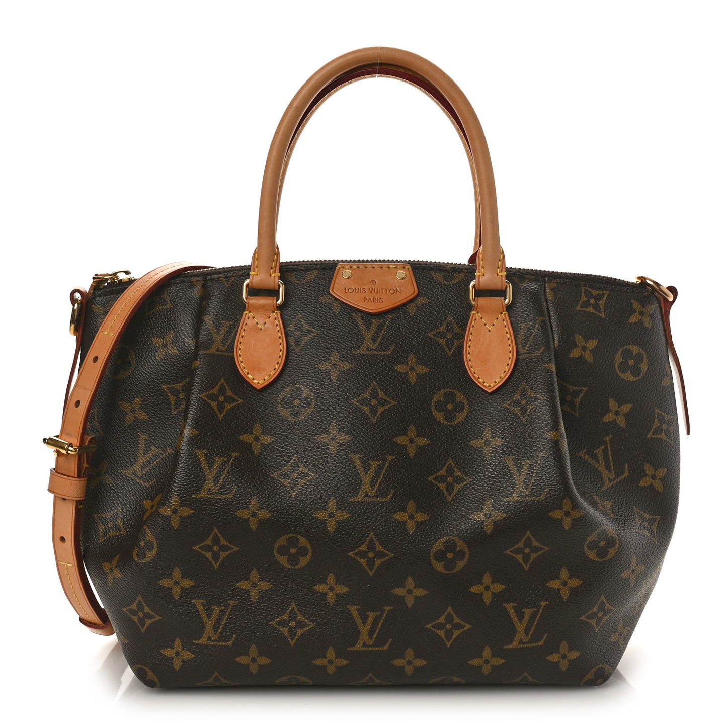 This is an authentic LOUIS VUITTON Monogram Turenne PM. This stylish handbag is crafted of Louis Vuitton monogram on a pleated toile canvas. The bag features vachetta cowhide leather trim, rolled top handles and optional shoulder strap with brass hardware. The top zipper opens to a plum purple fabric interior with patch pockets and gold d-ring.