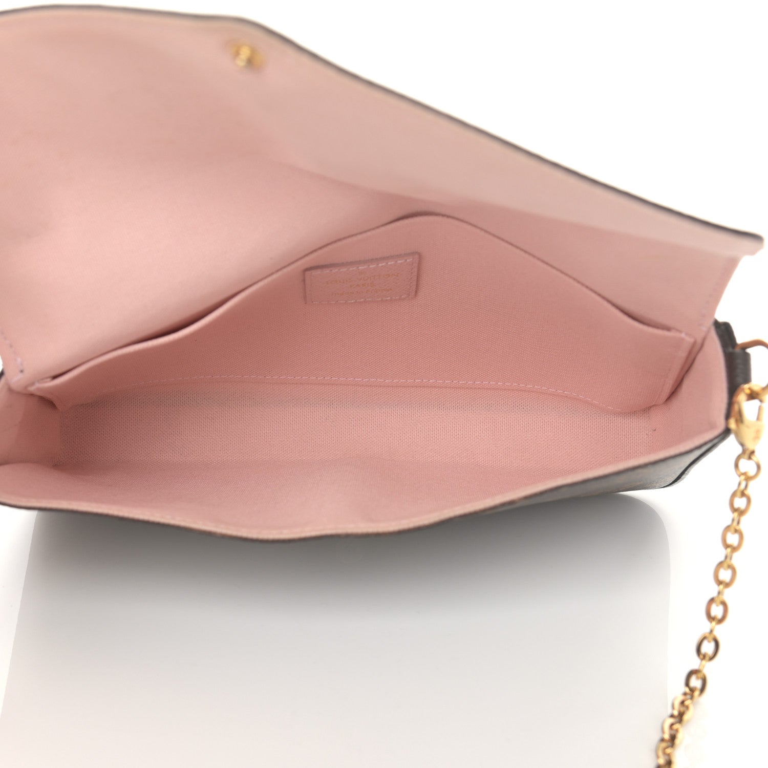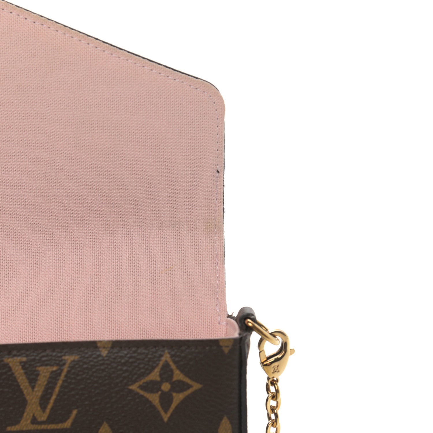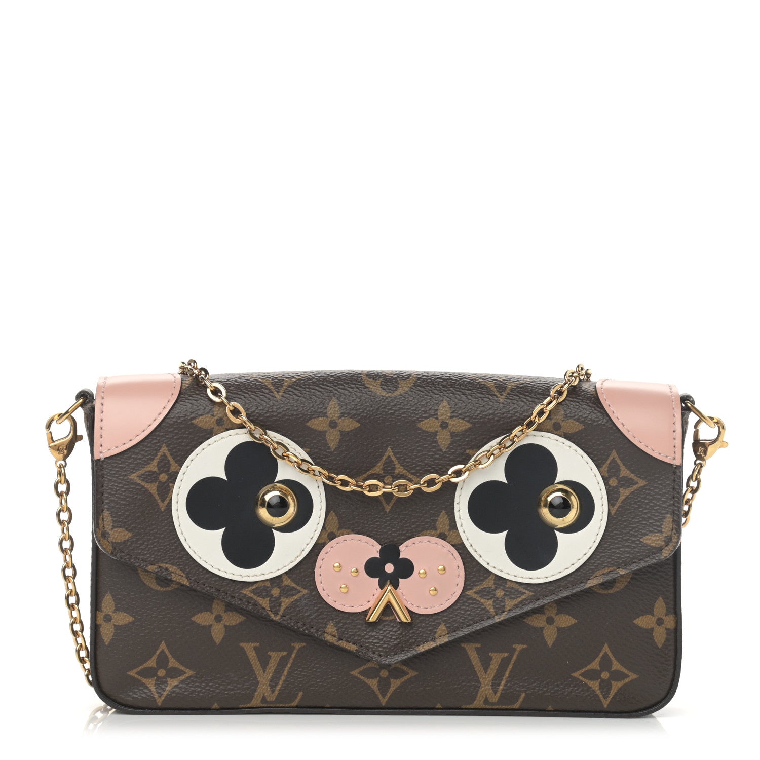This is an authentic LOUIS VUITTON Monogram Valentine Dog Pochette Felicie Chain Wallet. This stylish chain wallet is crafted of Louis Vuitton monogram toile coated canvas. It features a dog designed in leather patches on the front flap with an optional polished gold chain link shoulder strap. This opens to a light pink fabric interior.Follow this item for alerts. Louis Vuitton is a registered trademark of Louis Vuitton. FASHIONPHILE is not affiliated with Louis Vuitton.