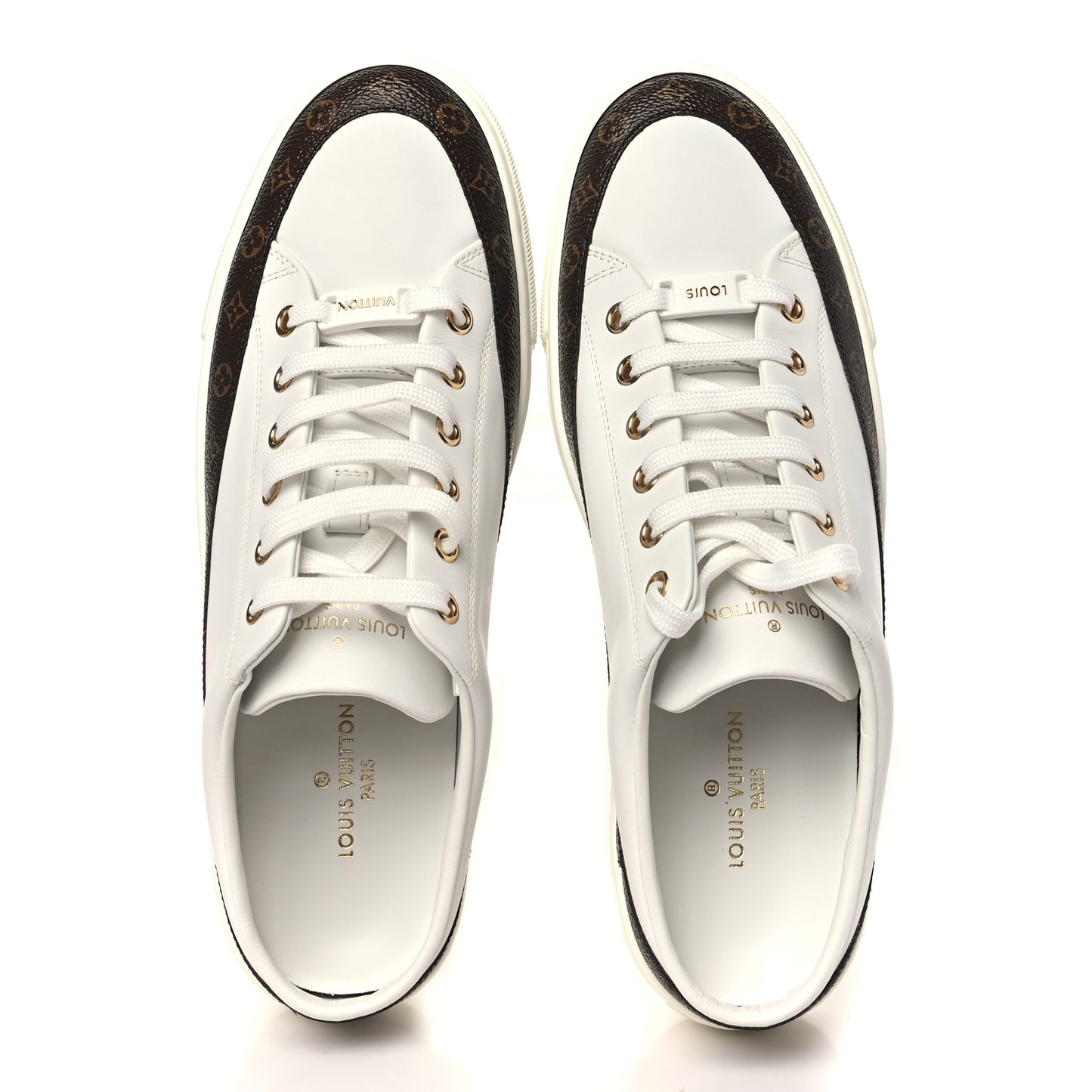 These are authentic LOUIS VUITTON Monogram Womens Stellar Open Back Sneakers size 39 in White. These sneakers are crafted of white leather accented with the iconic Louis Vuitton monogram coated canvas. They feature white rubber soles, white laces, and gold hardware.Follow this item for alerts. Louis Vuitton is a registered trademark of Louis Vuitton. FASHIONPHILE is not affiliated with Louis Vuitton.