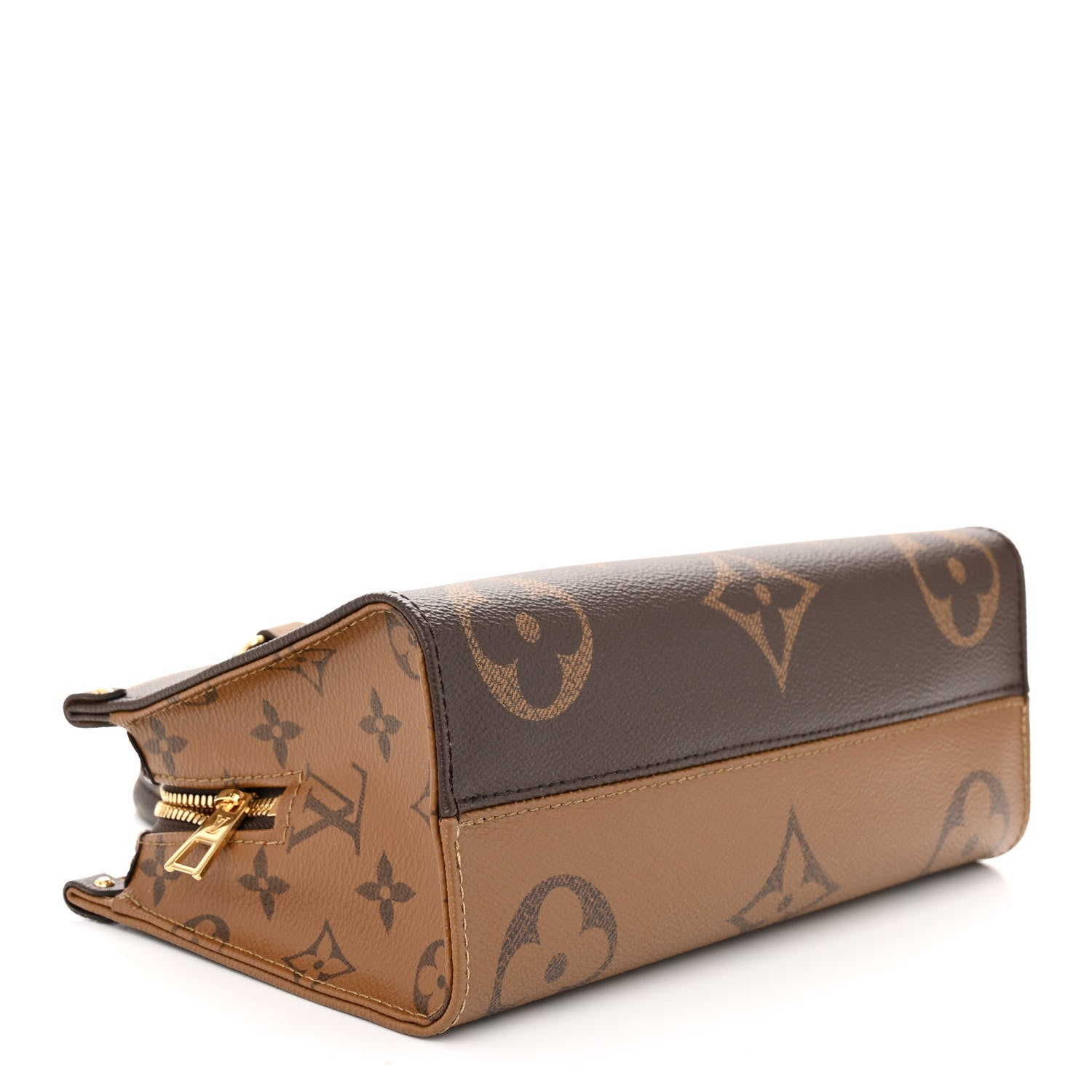 This is an authentic LOUIS VUITTON Reverse Monogram Giant OnTheGo East West. The chic mini tote bag is crafted of reverse Louis Vuitton monogram coated canvas with rolled top handles, an optional beige fabric shoulder strap, and polished gold-toned hardware. The top zipper is open to a red fabric interior.Follow this item for alerts. Louis Vuitton is a registered trademark of Louis Vuitton. FASHIONPHILE is not affiliated with Louis Vuitton.