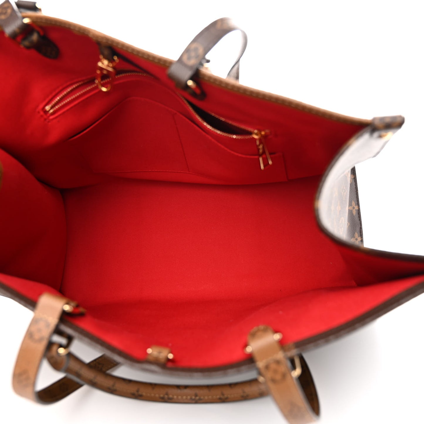 This is an authentic LOUIS VUITTON Reverse Monogram Giant Onthego GM. This tote features oversized and classic versions of the Louis Vuitton monogram printed in light and dark brown on coated canvas. The bag features rolled top handles and long shoulder straps that can be tucked away inside the bag, accented with polished gold-toned hardware. The top is open to a red fabric interior with zipper and patch pockets.Follow this item for alerts. Louis Vuitton is a registered trademark of Louis Vuitton. FASHIONPHILE is not affiliated with Louis Vuitton.